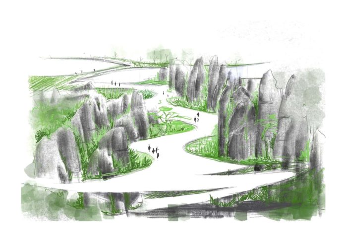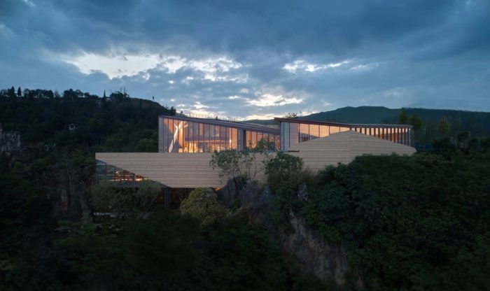 Incorporating the Natural Landscape- The architectural form seamlessly aligns with the contours of the stone, evoking a sensation of weightlessness through a “low intervention” approach. The structural system adeptly navigates around the stone forest’s obstacles, finding support within its voids. The indoor tree-shaped columns are lightweight, fulfilling the requirements for a well-lit and transparent primary exhibition space.