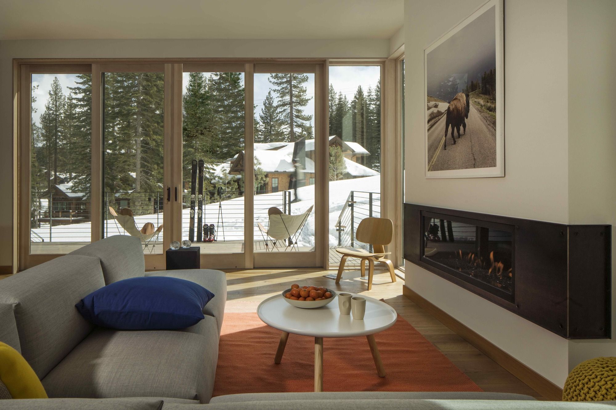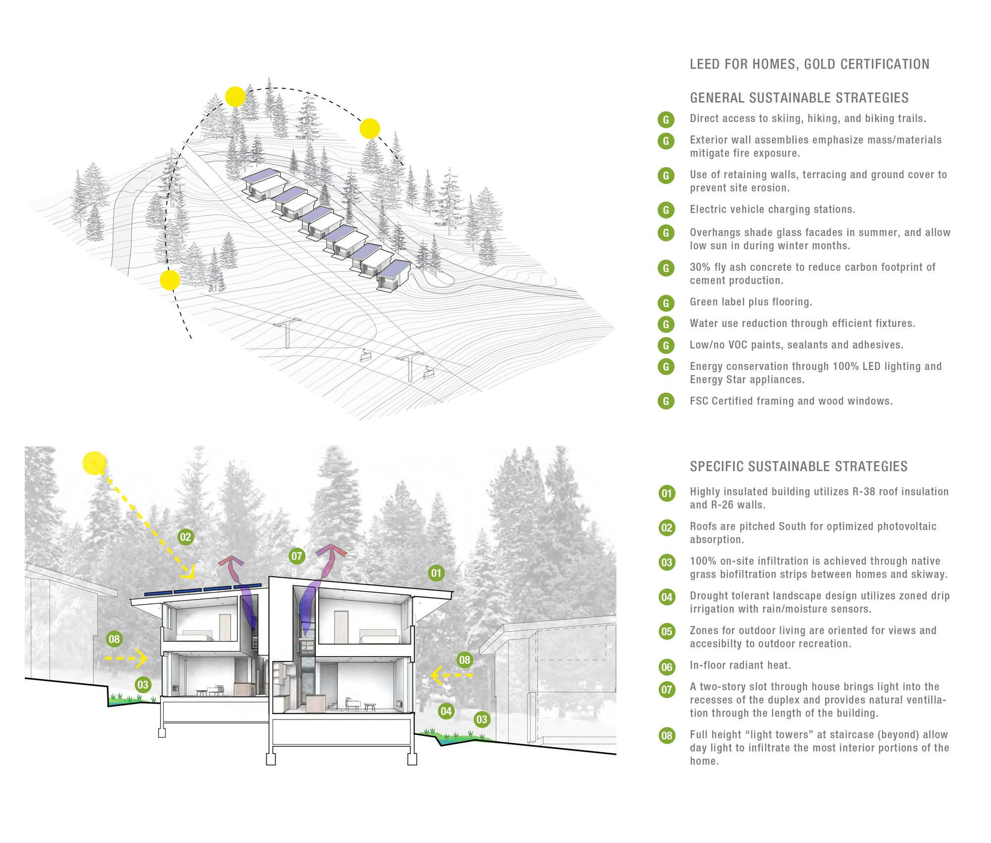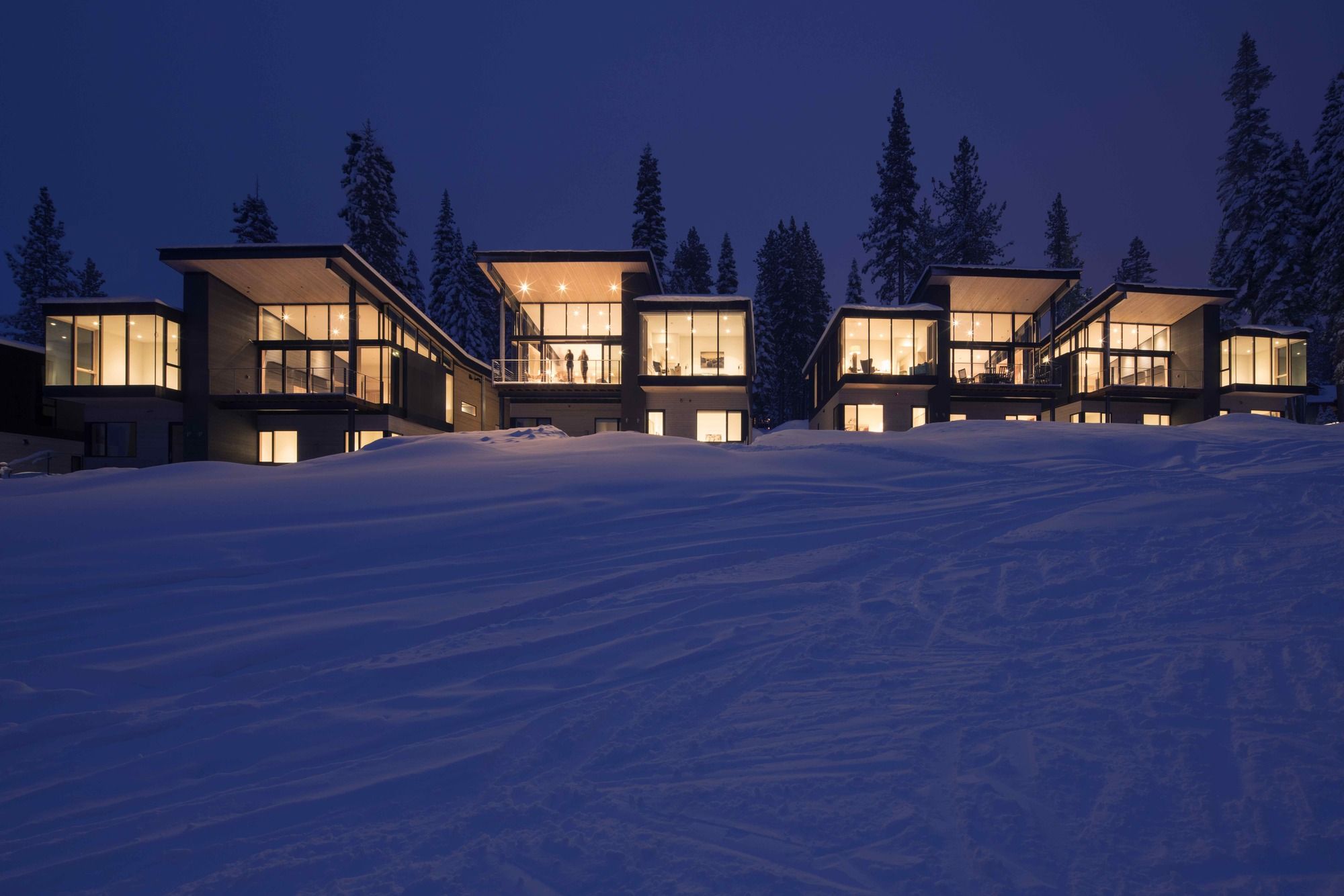 Located in a dense forest of Jeffery pine and Douglas fir, two distinct dwelling types—residences and townhouses—embrace the edge of a shared ski slope. Celebrating outdoor-living with direct access to skiing, hiking, and biking, the six single-family units and 11 townhouses visually and materially engage their surroundings, emphasizing healthy living and environmental stewardship, as demonstrated in the project’s LEED for Homes certification design standards.