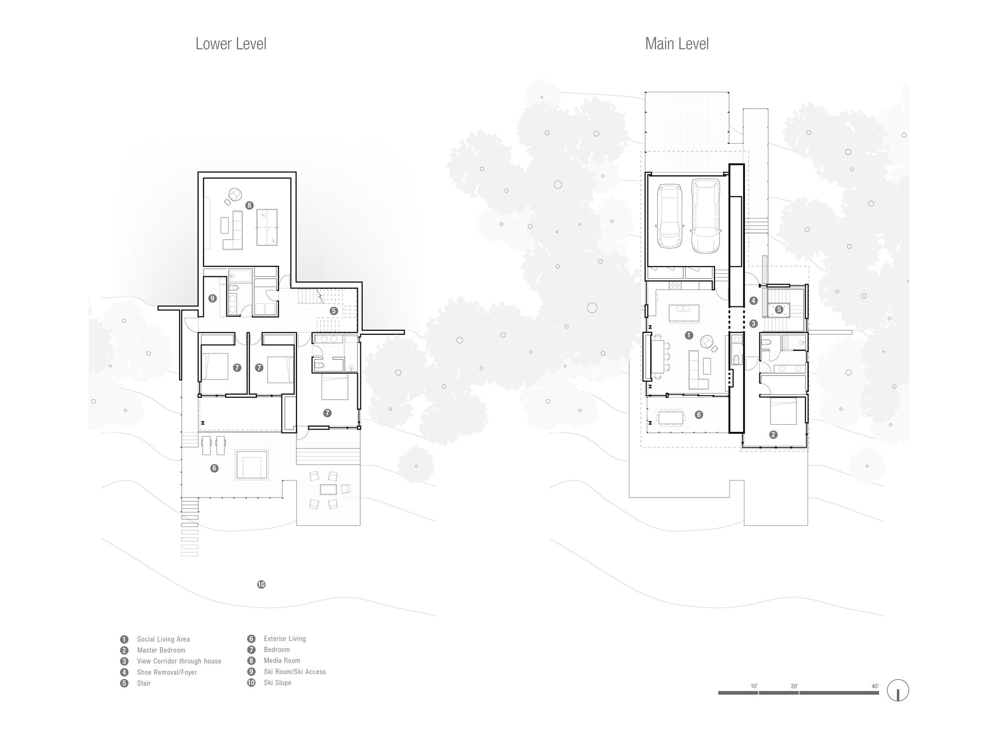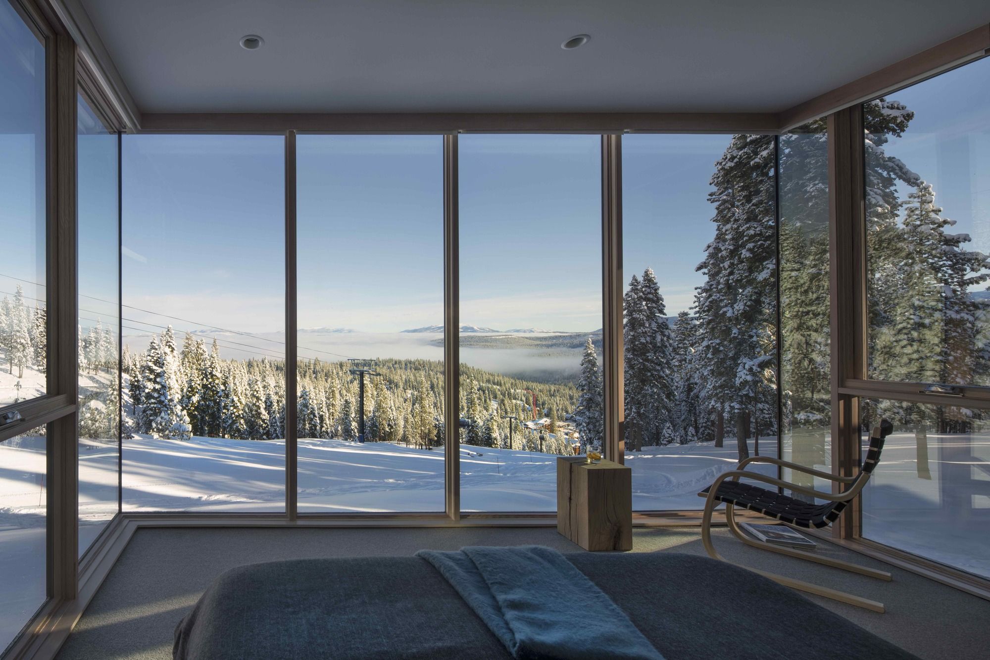 Upon entering the residences from their upper level, occupants are drawn into an elevated world, with remarkable views of Martis Valley and Carson Range beyond. Large expanses of glass offer a visual and physical connection to the outdoors, bathing communal areas in soft northern light throughout the day and framing sunlit views of the Sierra Nevadas in the evening. The master bedroom, immersed in sunlight via three exterior walls of glass, floats over the ski slope, causing one to feel as if perched in the trees.