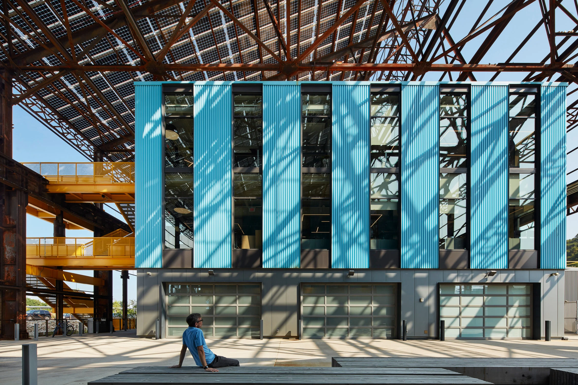 The RIDC Mill 19 technology campus, designed by Minneapolis-based firm MSR Design, occupies the ruins of a 70-year-old dysfunctional steel factory in Pennsylvania. It features three brightly colored buildings and a giant solar panel system on the summit. Pittsburgh’s Hazelwood neighborhood is home to the revitalization initiative, situated on an abandoned brownfield site just a few miles from the city’s central business district. The building has a view of the Monongahela River.