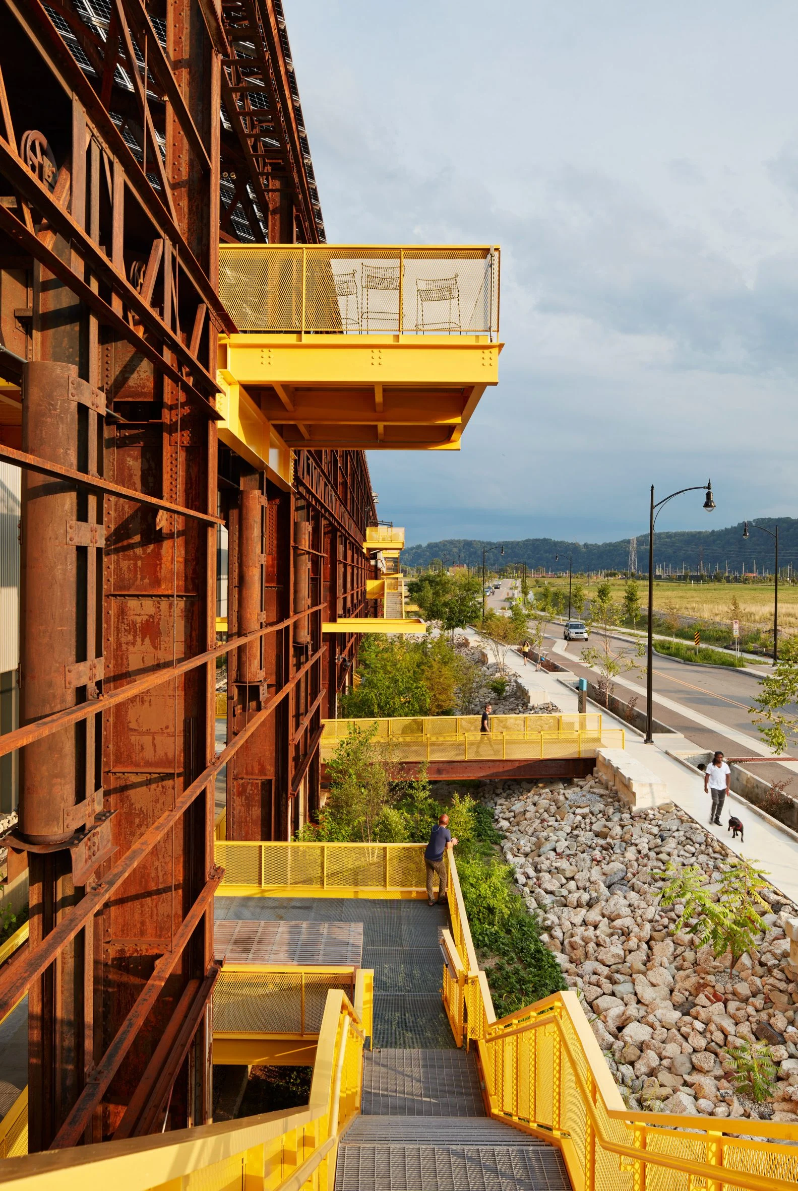 Clad in various metals, these three buildings stand out from the mill’s steel framework. An external passageway along the southwest level is between the new structures and the ancient shell. Skybridges float above the connecting area and lead to bright yellow stairwells.