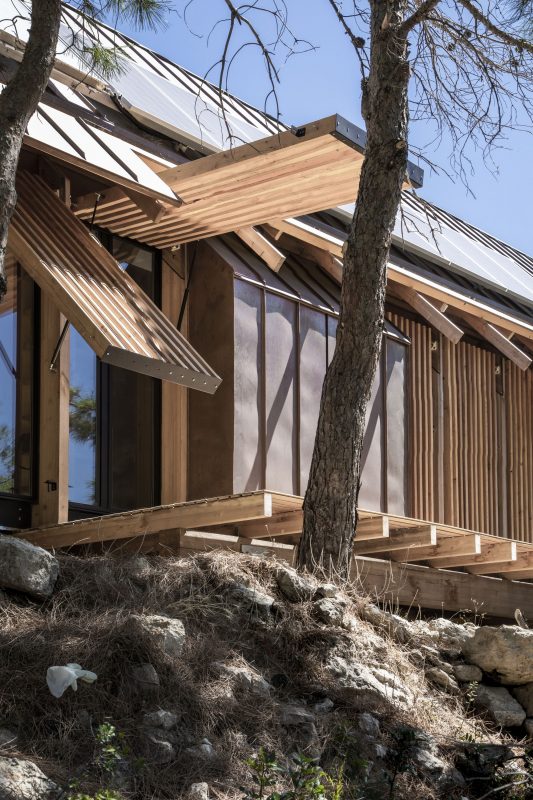 Ground source heat pumps and underfloor heating constitute an efficient system that makes use of minimal energy. The floor of the unit is raised above the ground, which allows air circulation below its surface. Building orientation, custom-made double-pane glazing, and piston-operated pine sunshades all protect the interior from direct sunlight.