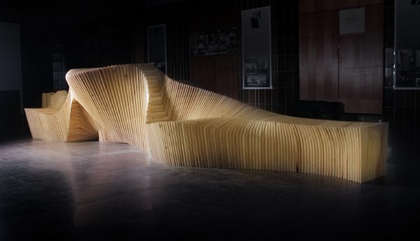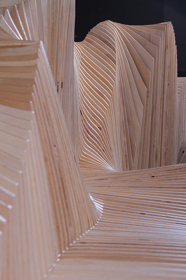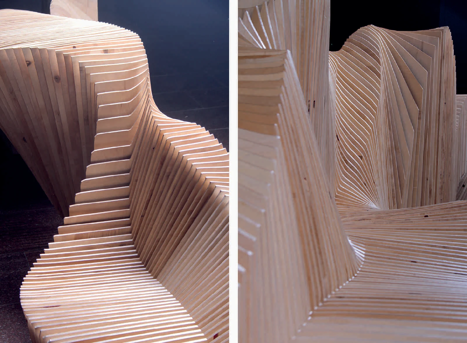 To streamline the production process was chosen as the method of splitting the object layer by layer. The segments were cut by CNC technology from plywood sheets by prepared vectors. Resulting elements are fastened together with thread rods which are uniformly distributed over the cross section segments of the bench to ensure its sustainability.