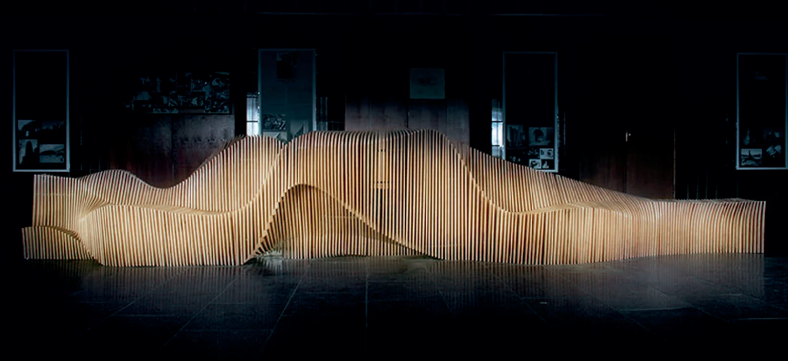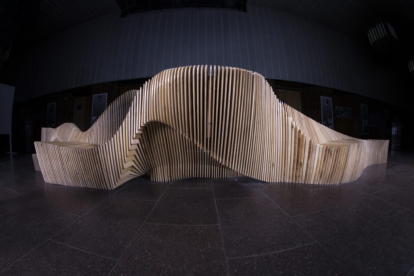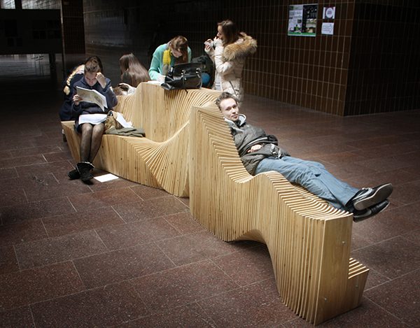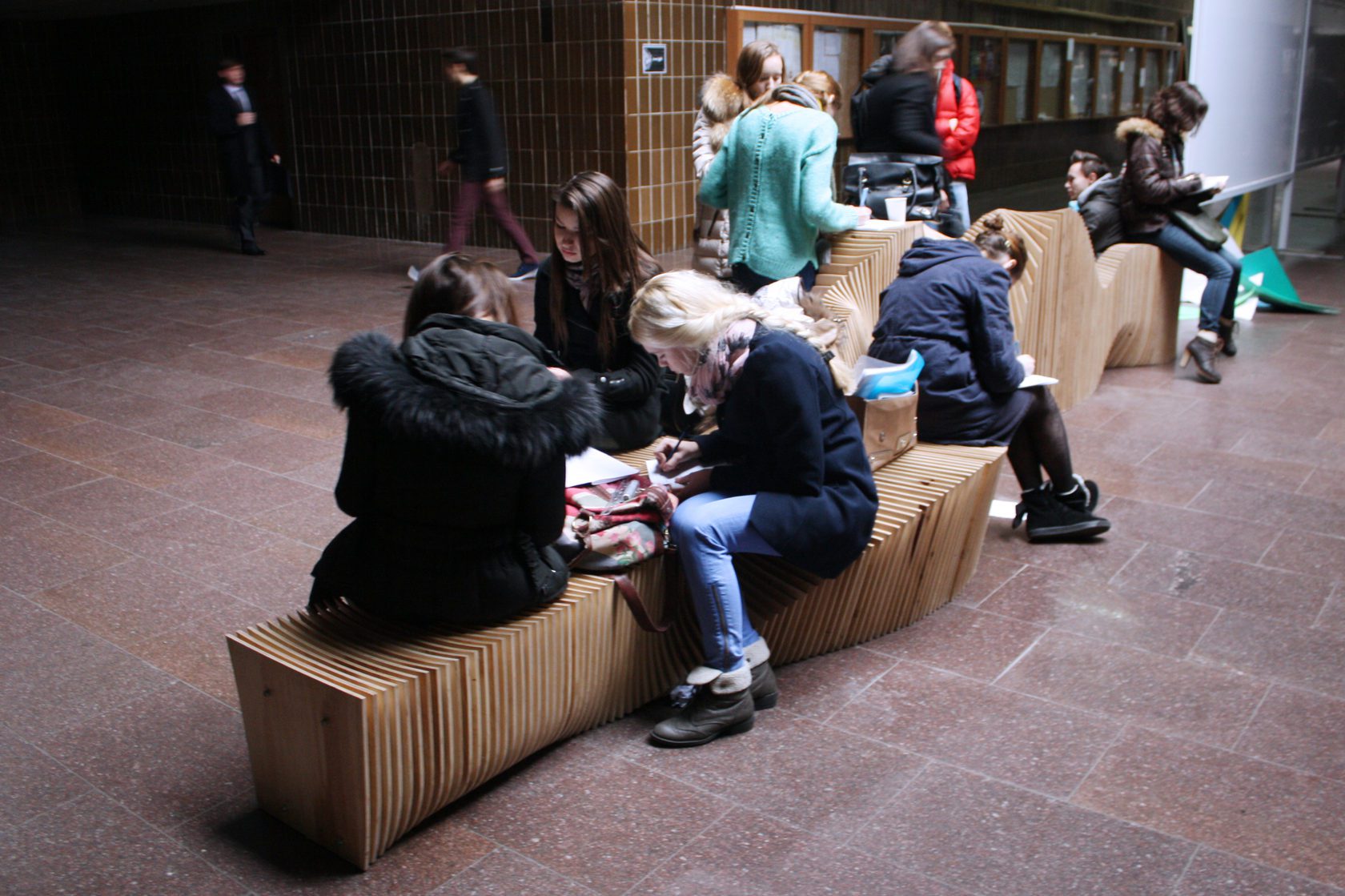 The project of a multifunctional bench was designed by students of KNUCA Roman Sakh and Konstantin Kuchabskyi . The main idea in the project was to create the object which includes a variety of different functions of the public space in the university hall. Starting point point in the modeling of the bench were different scenarios of using the object. The variety of chosen scenarios formed the basic of the creation of geometrical sections of the object. Sequence of the sections made it possible to create a single volume subordinate (which depend to) fluid geometry.
