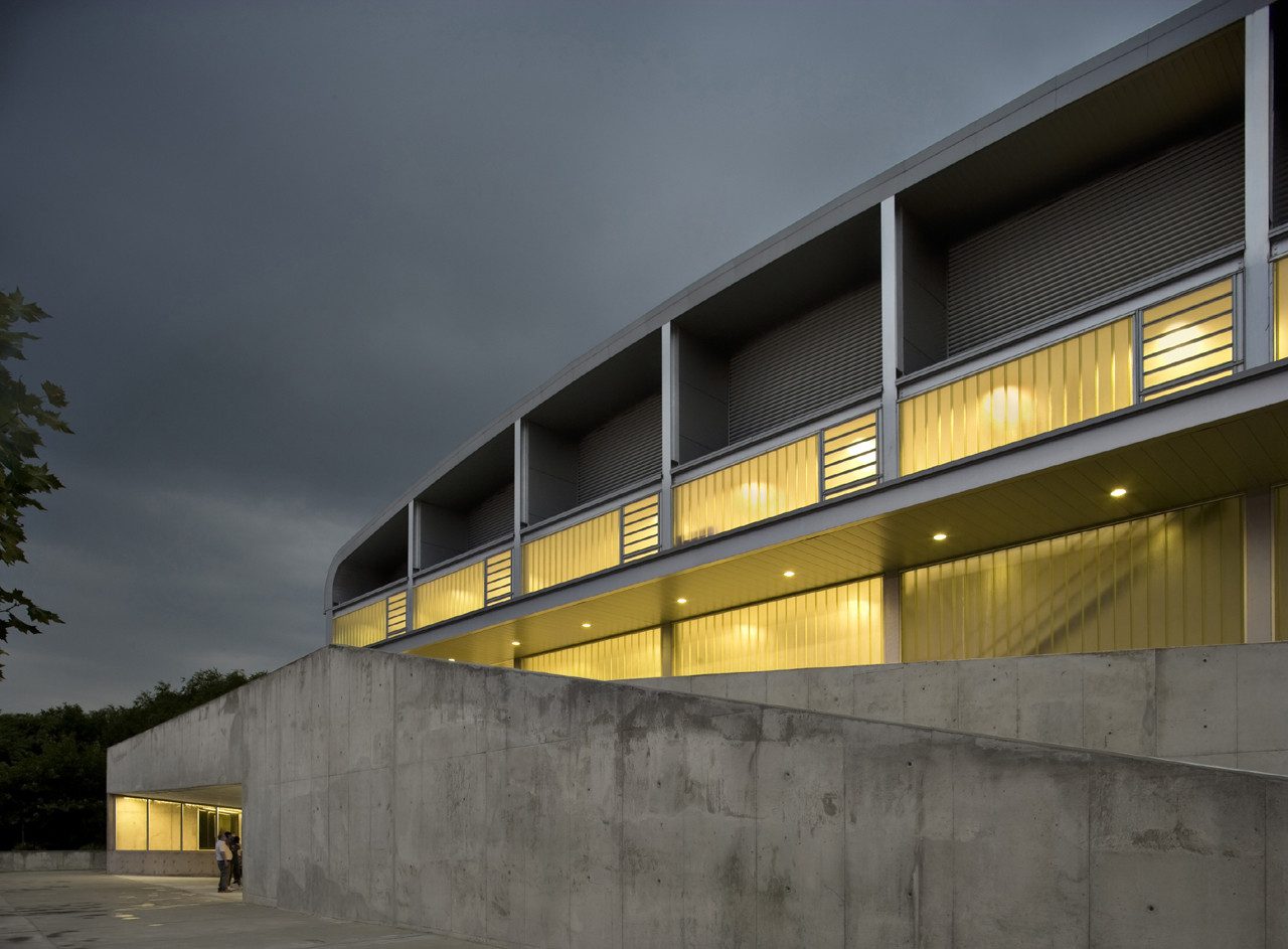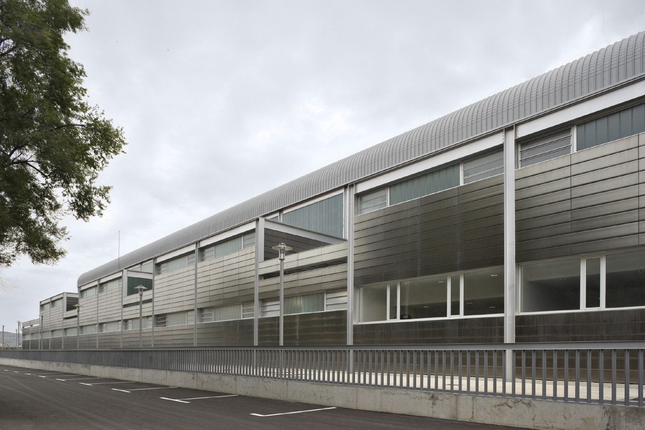 The ends of the building, corresponding to the south and north facades, reproduce the cross section of the sports center, with a continuous plane in the case of the north facade, where the U-glas surface on the upper area is laid out on the lower stripe of less height corresponding to the cafeteria and kitchen volumes on one side, and the services core on the other, both separated by an open courtyard. A catwalk, arranged in continuity with the metallic staircase and cantilevered over the facade, connects the emergency exits with the exterior platform.