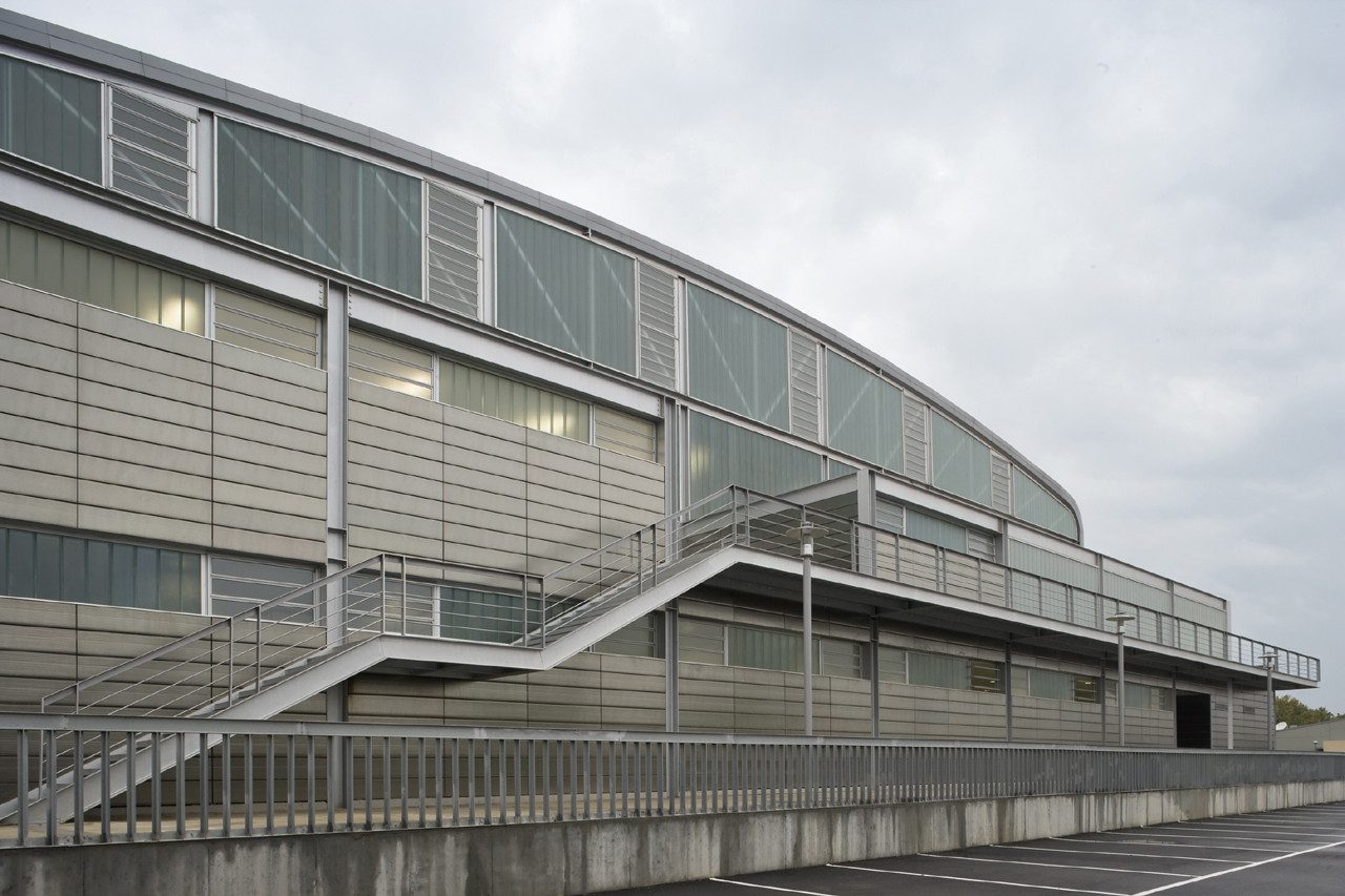 The roof is designed to unify the building, which projects to the exterior the volume of the great interior space, shaped as a lay vault, with a continuous, centered arch section, covered with metallic panels. On this smooth curved surface emerge four staggered rows of conic skylights, oriented to the north, clad in steel sheet.