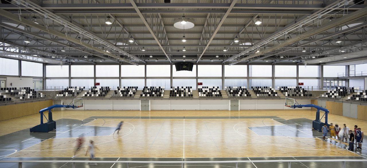 The center is organized into two main independent levels. The lower level contains the track, which has, from the south, the main access for users, athletes and organization. Four strips of varying width around the track house access, meeting rooms, storage, locker rooms, multipurpose rooms, medical kit, referee and coach locker rooms, and facilities.