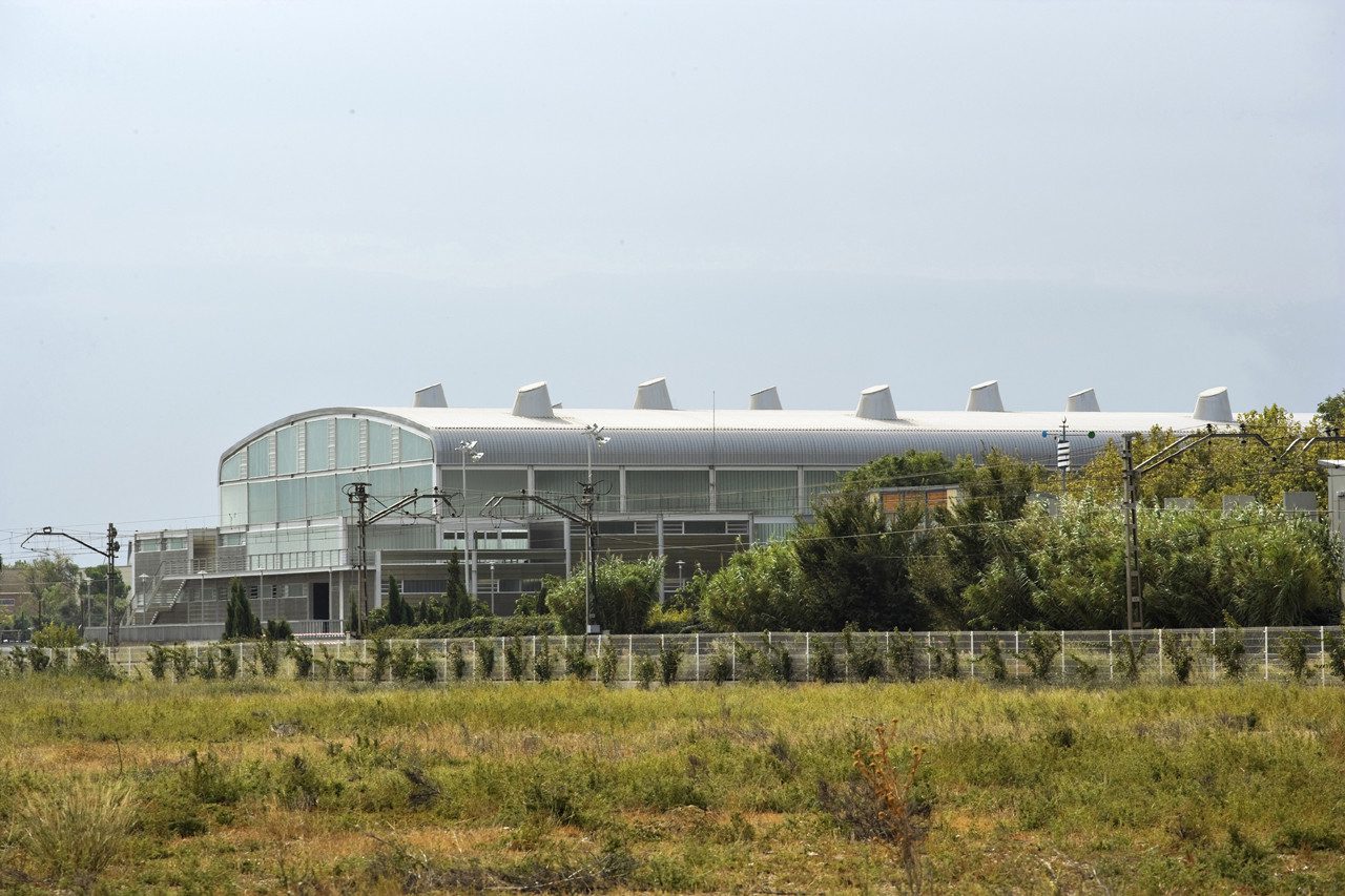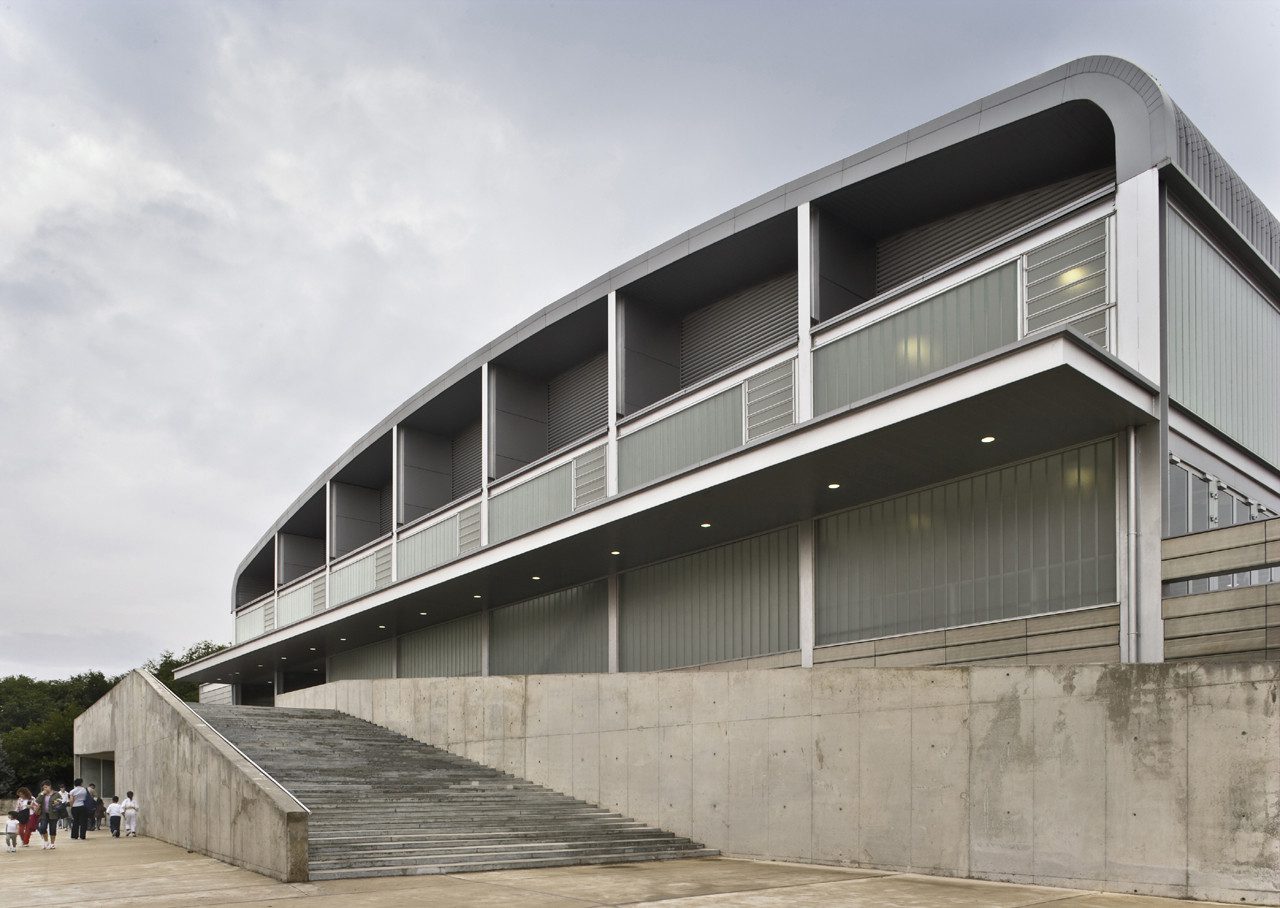 The relationship between the roof and the sequence of skylights provides the center with one of its hallmarks, giving it a changing face, from the most distant views. Under the roof volume, the building shows an envelope constructed from smooth glass panes, patterned by the metallic supporting structure.