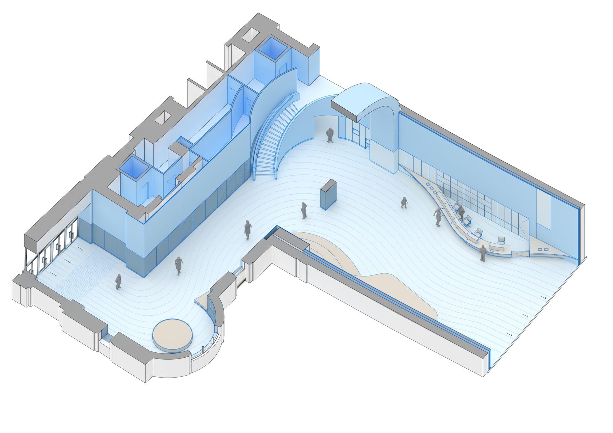 The museum’s renovation aimed to create a practical space for visitors and staff to work, explore, and interact by reconsidering how things are arranged within its services. The Musée National de la Marine boasts a design that incorporates curved and circular shapes, aligning perfectly with the existing structure of the building. The design draws sub-tle inspiration from the graceful flow of water, resulting in a lively architectural style that promotes a more natural and seamless interaction. This design style also makes moving around and connecting different museum areas easier.