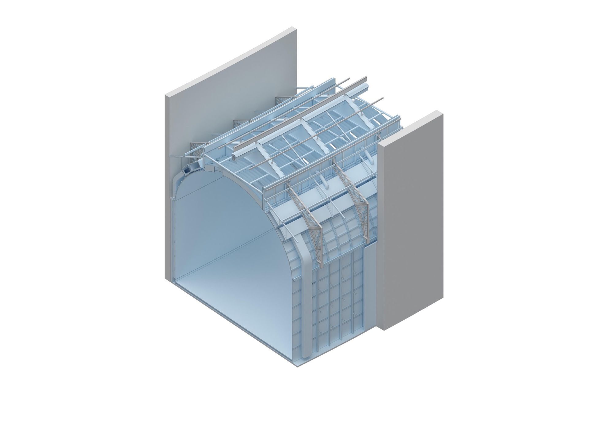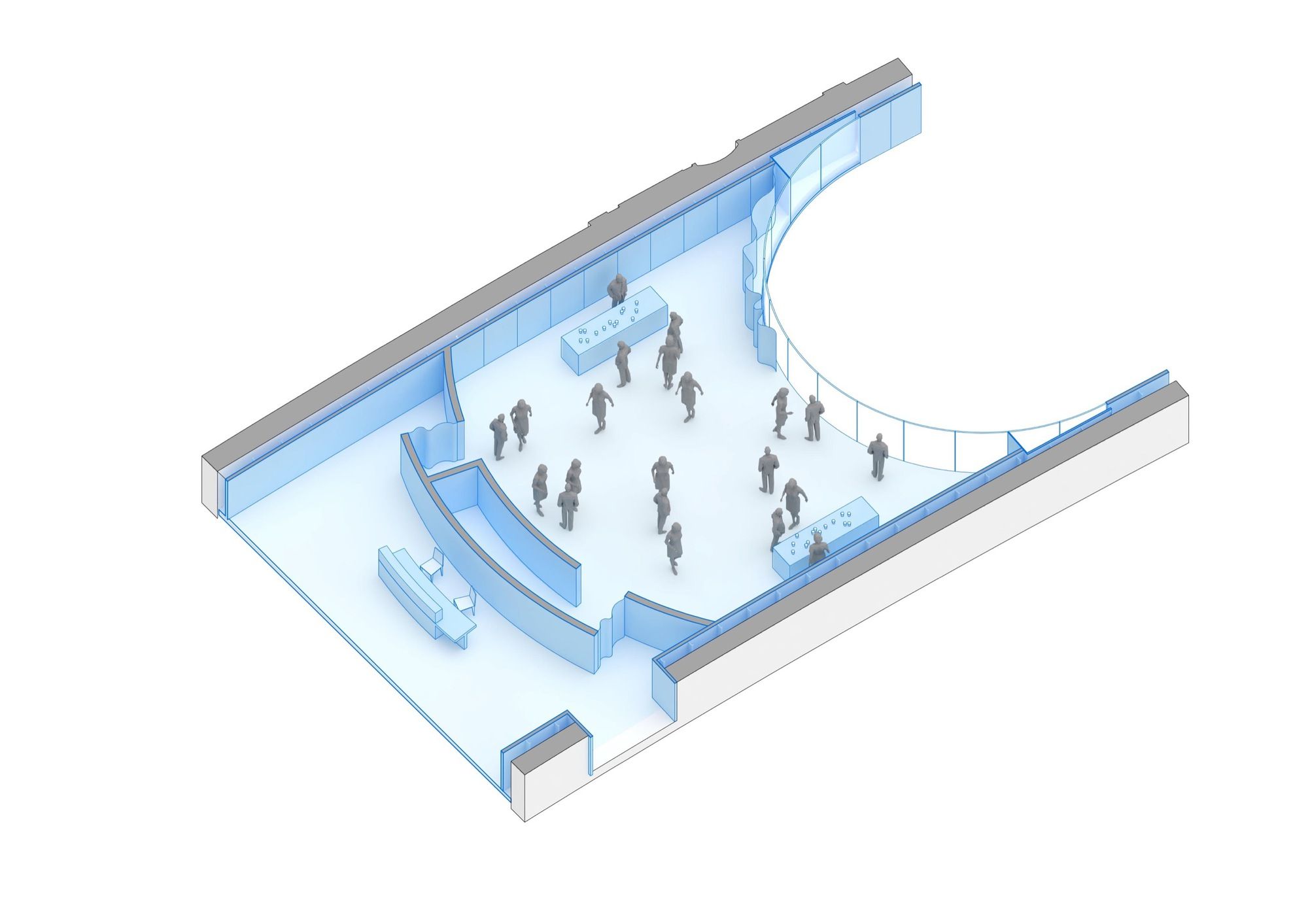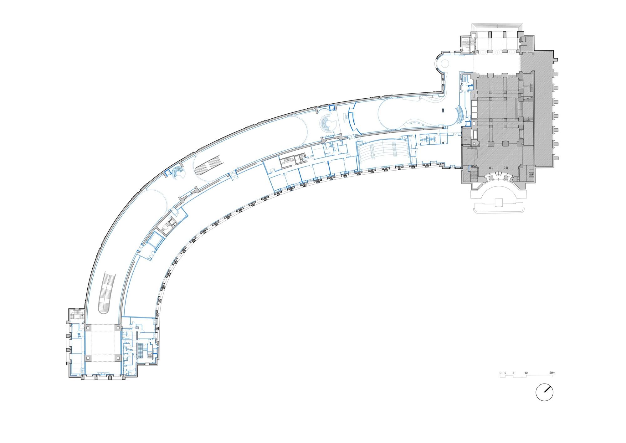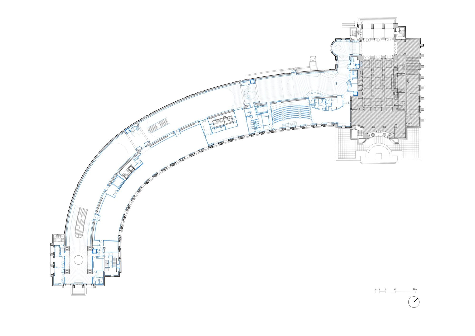 The Galerie Davioud’s original design from 1937 is elegantly displayed through transparent elements. These elements provide a glimpse into the newly added mezzanine levels, which include a pressroom, members’ lounge, and exhibition space. A dual-purpose wall serves as a practical transitional area, enabling the accommodation of technical equipment needed for exhibit setup while maintaining the thermal envelope.