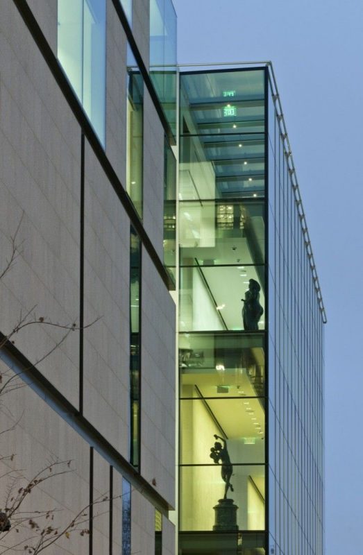 The 103,000 square meters plan of the 133,491 square meters complex consists of a rectangular central building connected by glass bridges to a couple of ancient square pavilions in order to form the Art of Americas Wing. 5000 works, including 30 percent of the American authenticities, are arranged chronologically in 53 galleries of the tetrad floors, which sums three times more to the past exhibits as many of the artifacts, were anguished within the walls of the cellars due to space shortage. Boston architect Guy Lowell’s Beaux-Arts plan from 1907 incorporates the core master-plan and the re-insertion central axis was a part of it. The heart of the axis lifts the soul through a lofty space of 21 meters height while accommodates a new information center. The freestanding glazed structure works as a crystal spine which frames the skyline of the marshy Back Bay Fens Park.