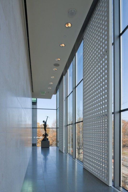 The crystal spine diffuses with the central axis through enclosing a part of the courtyard by the glass ‘Jewel Box’. The 63 feet high ceiling of Shapiro Family Courtyard formulates a lofty breathing space reinforced by a blissful sunshine and the interplay of outside greenery. The courtyard holds spaces for visitors’ orientation, a café and a new gallery for the special exhibitions underneath. A new-state-of-art Alfond Auditorium with a capacity of 150 guests is placed right beside it. A new landscaping approach is applied for the long abandoned park designed by Friedrick Law Olmstead in 1877. The new greening followed Olmstead’s romantic tradition of winding paths and informal planting which invites the green into the heart of the building. The vegetation acts as nodes to the different galleries while composing a successful indoor-outdoor relationship.