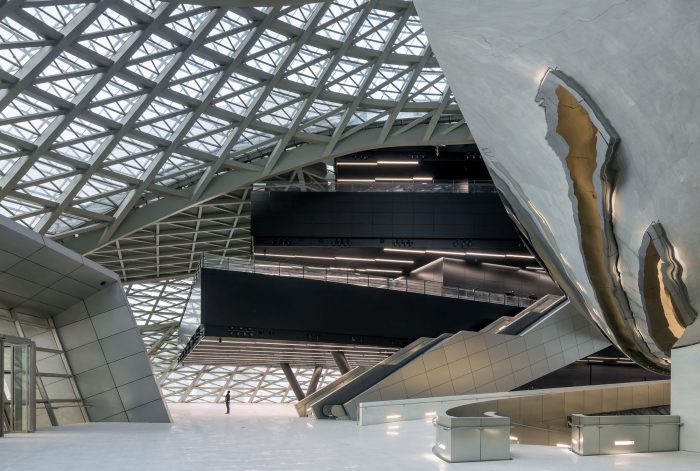 The 80000 metre square museum with its transparent façade and interior lighting allow for an interior – exterior communication putting in evidence the main circulation atrium between the two volumes. This also permits unhindered view from the inside on the cityscape whiles giving the visitor the impression of being in a shaded outdoor area.