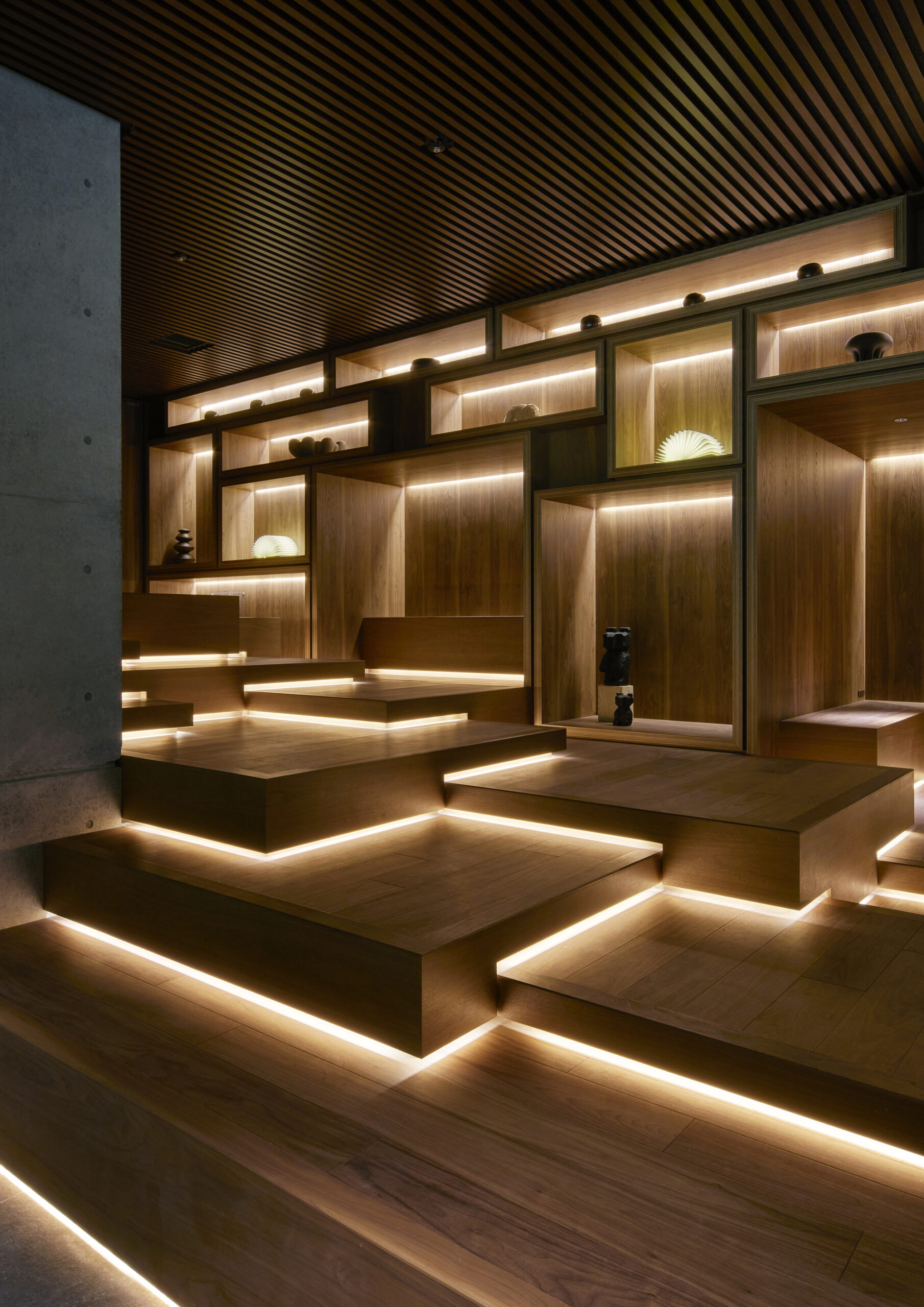 The entrance is located on the basement floor, and common areas such as the reception, restaurant, spa, hot springs are arranged around the “Four Seasons Garden” (shiki-no-niwa), a courtyard in the center of the building. The Garden has a grove of Japanese maple trees native to the town, while the ground is paved with rocks excavated from the site. The courtyard captures the natural beauty of Niseko and welcomes guests with different expressions throughout the seasons.