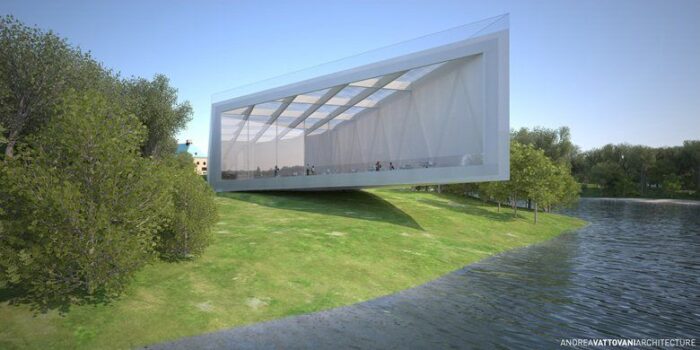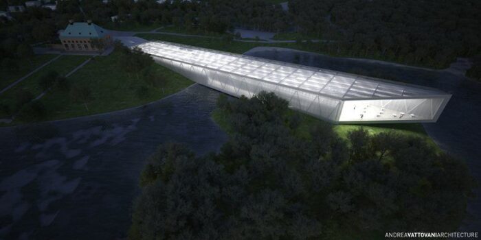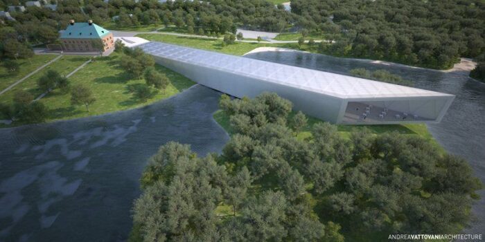 We realized with historical research that the island was always important since the early age of the existing building. In historical images you can still see the way going from the house to the island. After finding out this information was clear to us that we wanted to reinterpret this connection and respectfully decided to re-create a bridge and bring our visitors to the island. The visitors will metaphorical retrace the original path to the island. The promenade will be again here but this time the trees will be replaced trough a white metal framework and the bridge will be the building itself.