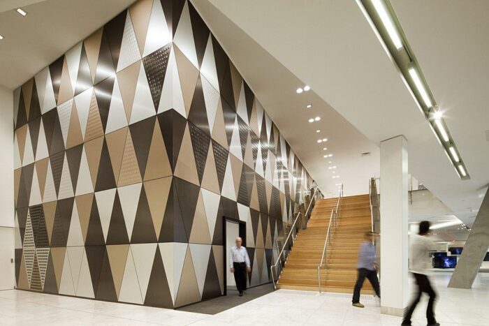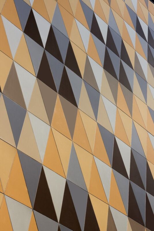 The Little Bourke Street façade has been completely rebuilt as a contemporary counterpoint to its 1920’s Bourke Street companion. The distinctive harlequin pattern across the façade is a geometric interpretation of the Art Deco motifs found throughout the old store. The façade pattern is further extended into a series of three dimensional display windows designed to allow views into the upper levels of the store from the narrow street below.