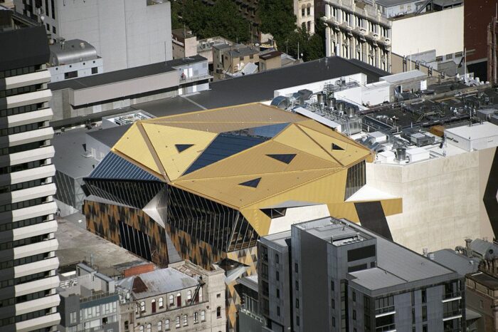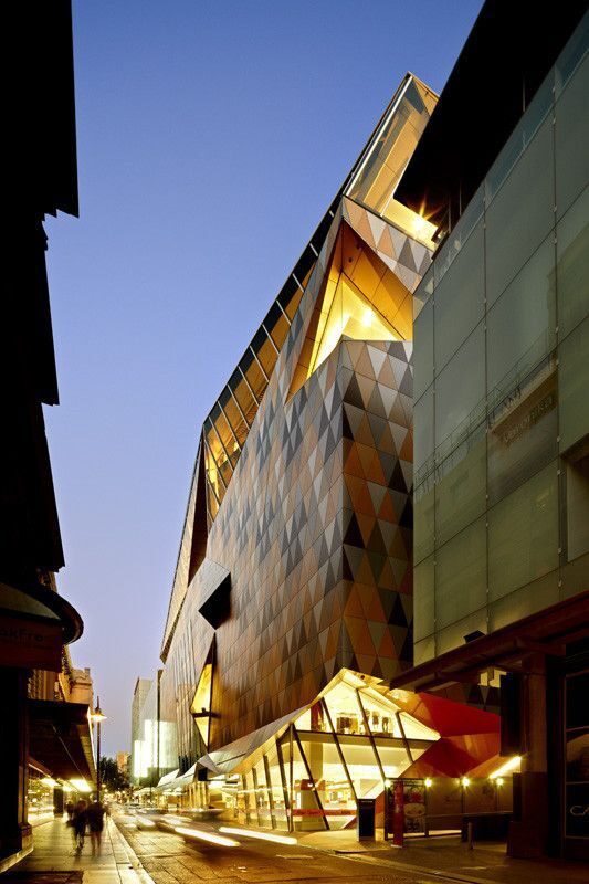 The most striking emblem of Myer’s new face to the city, visible from many surrounding buildings, is its faceted gold roof. The pavilion roof has been architecturally sculpted with gold metal and glass to choreograph certain city views from within and to bring the cityscape of Melbourne into the heart of the store.