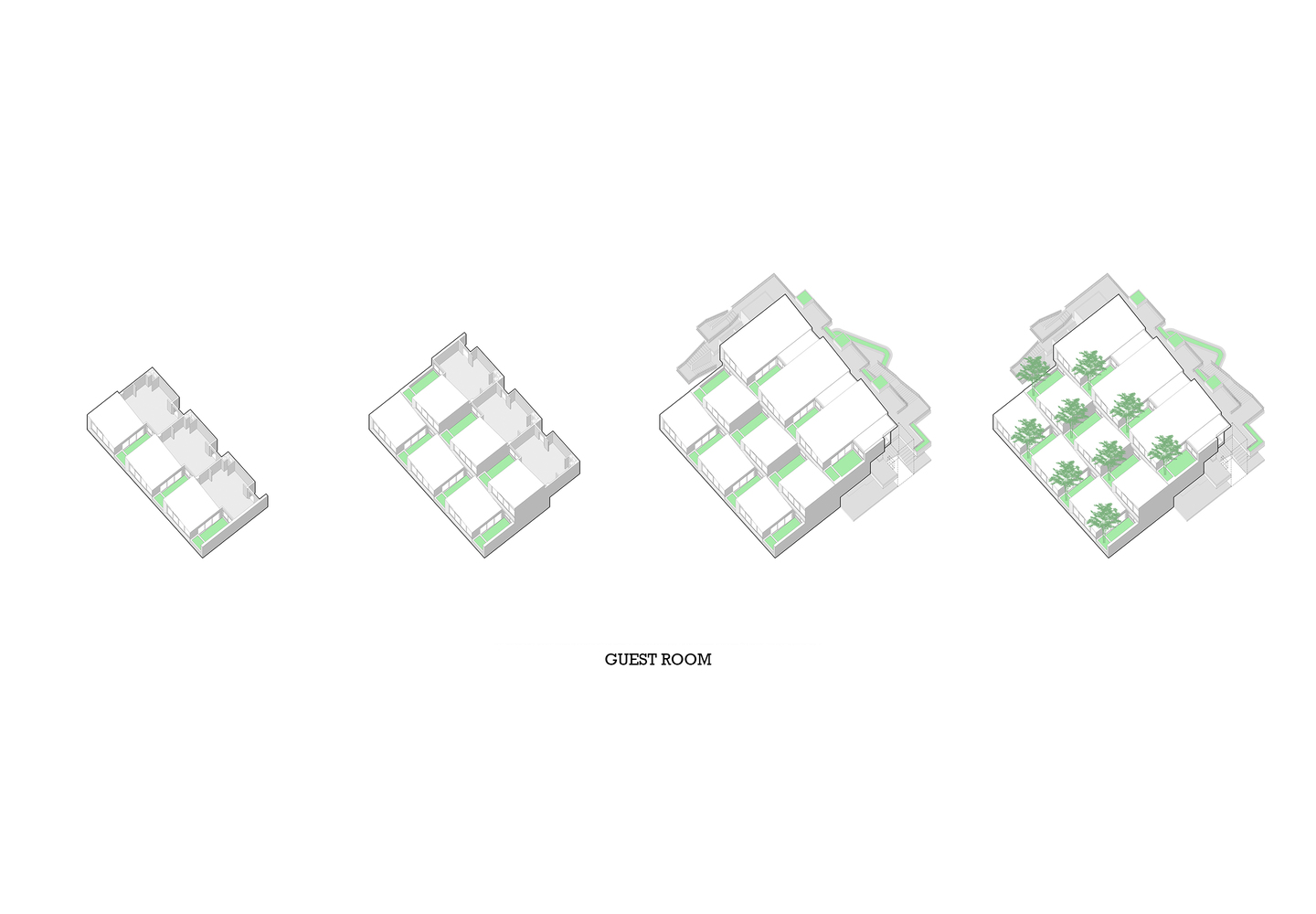 Despite facing spatial constraints due to regulations, each room is crafted as a luxurious forest cabin with a verdant balcony. These spacious suites encompass a living area en-suite bathroom and even boasts the presence of trees.
