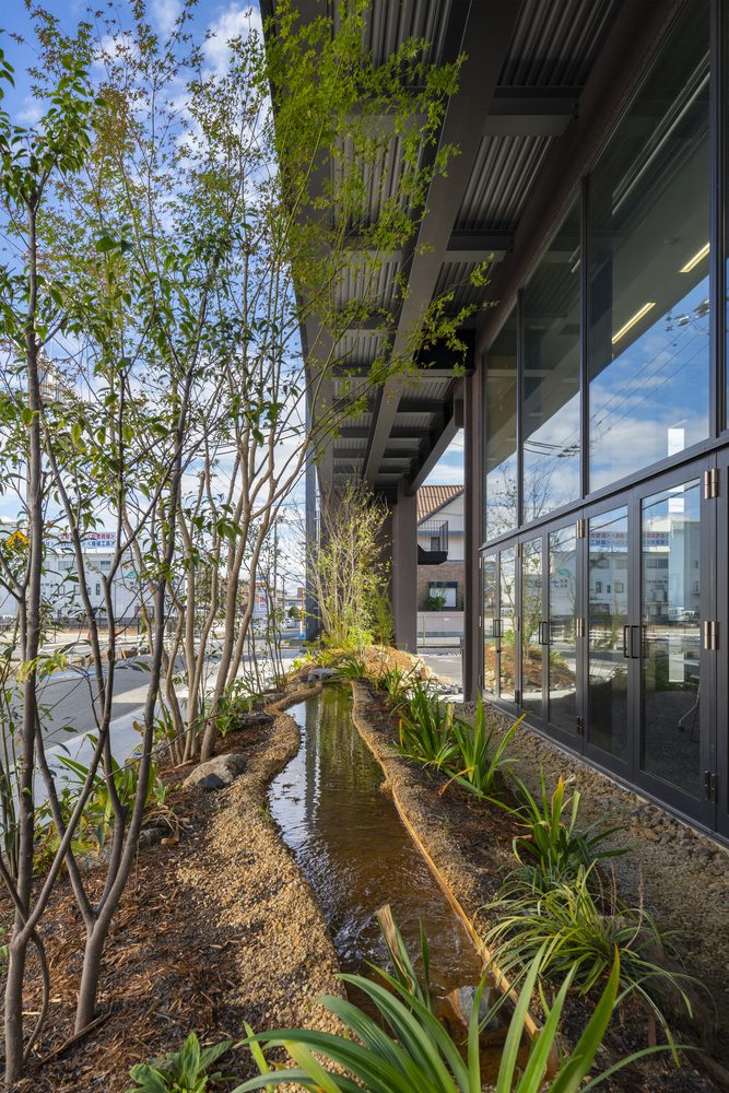 The lush greenery and flowing water create a garden that evokes the natural beauty of the Manyo era. Incorporating elements of traditional Japanese wisdom such as courtyard gardens, skylights, eaves, verandas, and the use of underground water, the building exemplifies sustainable architecture.