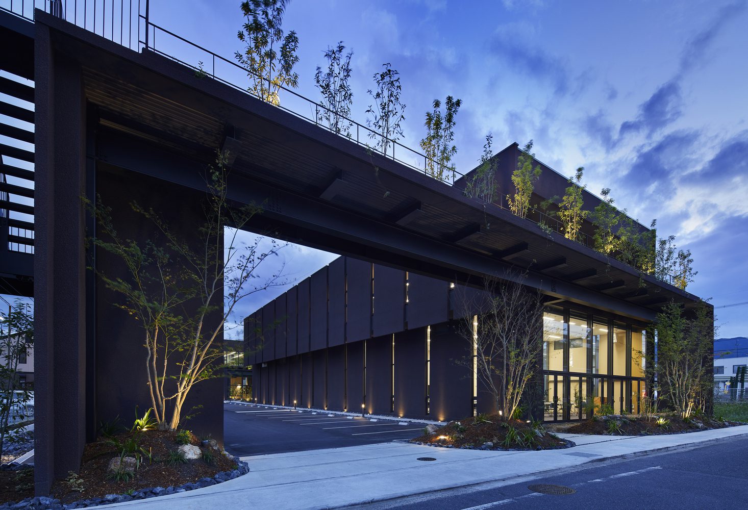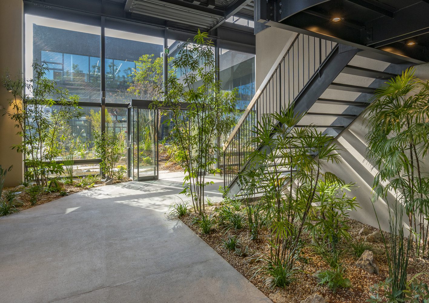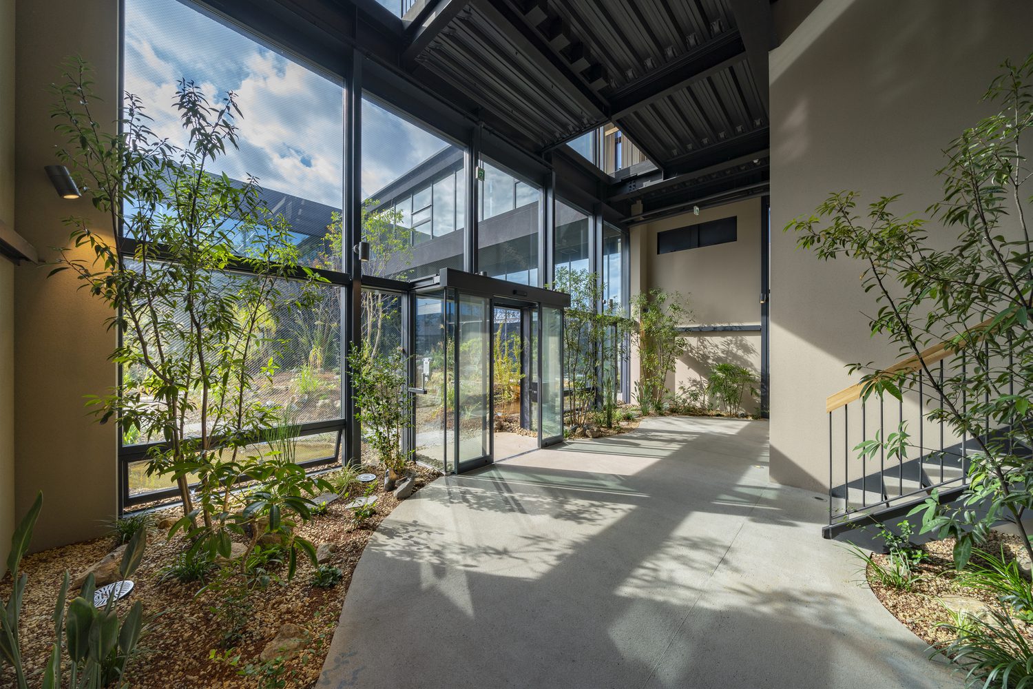 The site stretches roughly 100 meters from north to south and features two buildings separated by a central courtyard, which are linked by a bridge. At both the northern and southern ends of the site, gardens have been carefully integrated. The gable side of the buildings, which faces these gardens, is fully glazed, fostering a sense of connection as people can observe one another during various activities. The interiors overlooking the courtyard are lushly planted with trees, blurring the boundaries between indoors and outdoors to create a seamless “room within a garden” experience.