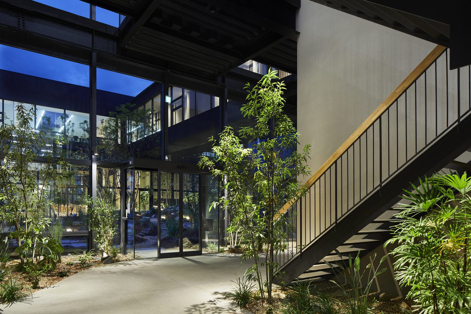 The soothing sound of water resonates throughout the building, enhanced by the greenery and water features thoughtfully distributed across the space. At the heart of the structure, a stairwell connects to a “light garden,” while strategically placed slit windows on the east and west walls promote airflow. Overhead, the skylight is fitted with a perforated aluminum shade that diffuses natural light and facilitates heat ventilation through its upper opening, ensuring a comfortable, airy environment.