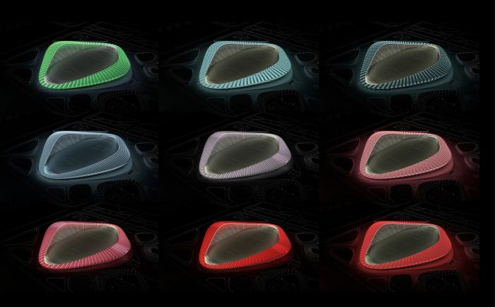 The epicenter of the scheme, the main stadium is a form that seems to slip almost asymptotically from and past the ground upon which it stands. It is constructed of a ribbed structure with a tensioned skin enclosing the form. This is imbued with a nocturnal life by an intelligently designed lighting system which casts differing colors against the skin, reminiscent of skin tones- ever changing with mood and circumstance).