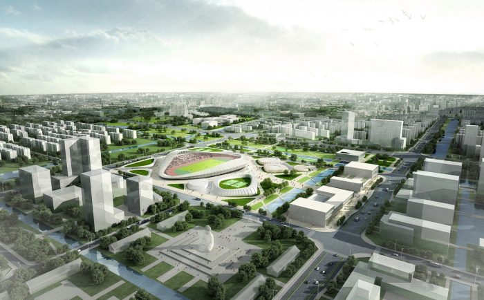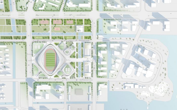 The basic modules for each building consist entirely of diamond-shaped cells which hold various functions and corresponding sizes: small (S), medium (M), large (L), and extra large (XL). Starting from the central stadium cell, the cells are propagated outwardly. As the center of the overall complex, the sports stadium occupies the XL format cell, equipped with a 400-meter running track and seating for 15,000 spectators. Its characteristic building structure is based on a ribbed supporting framework, covered by a translucent membrane. A dynamic lighting system illuminates the stadium roof at night in alternating color combinations.