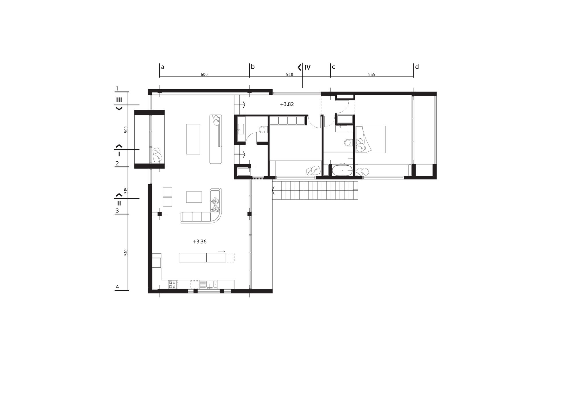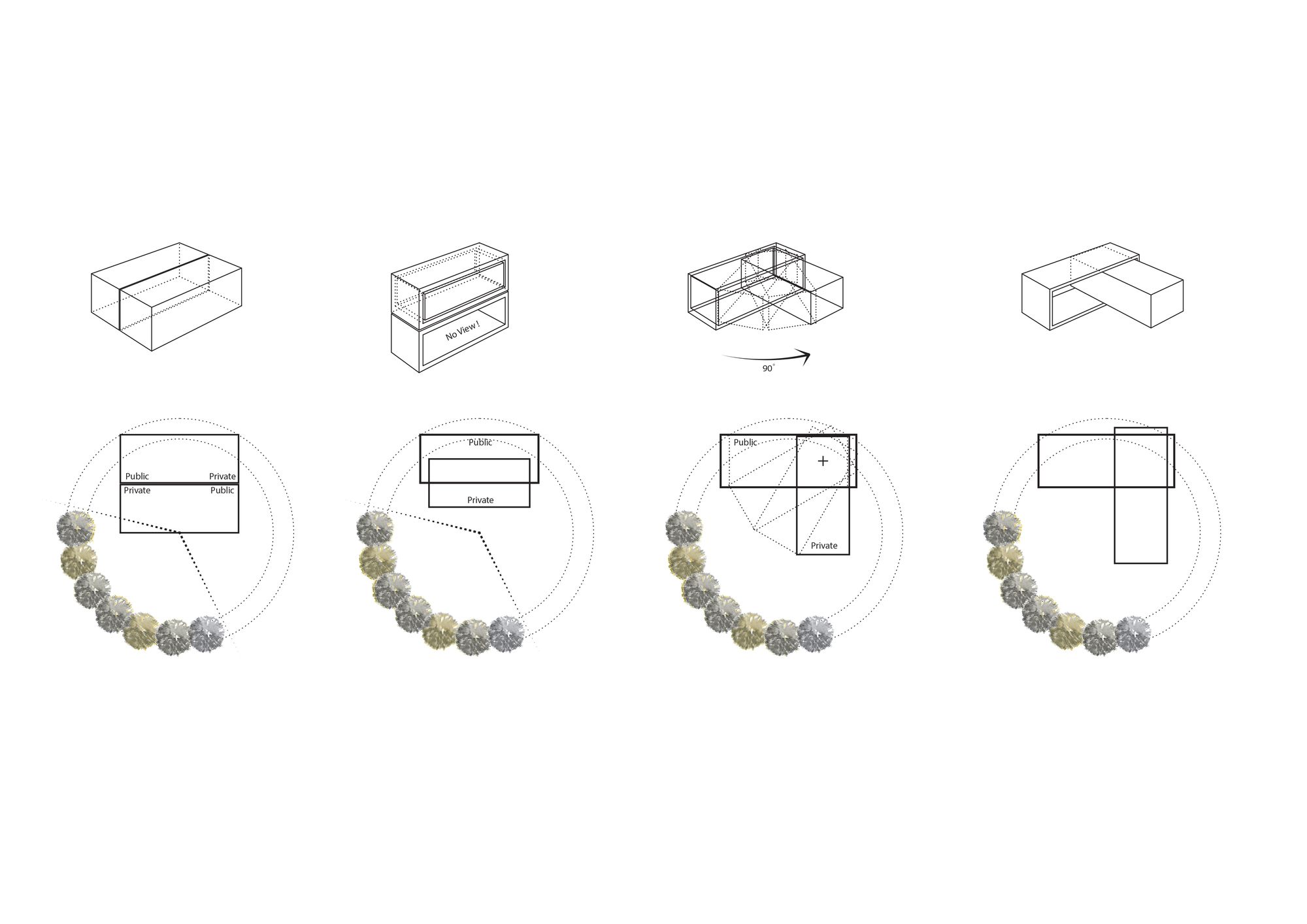 Design started with separating the public spaces (living room, kitchen) and private spaces (bedrooms, bathrooms) as two independent boxes. The only configuration that would allow all the interior spaces to have a view to the gardens while maintaining their independence was to juxtapose the boxes in an L shape form while having a common ground.