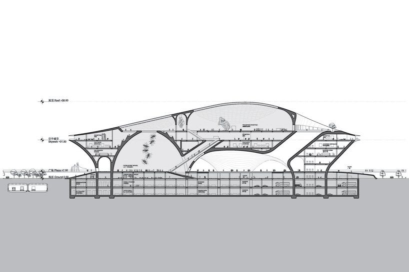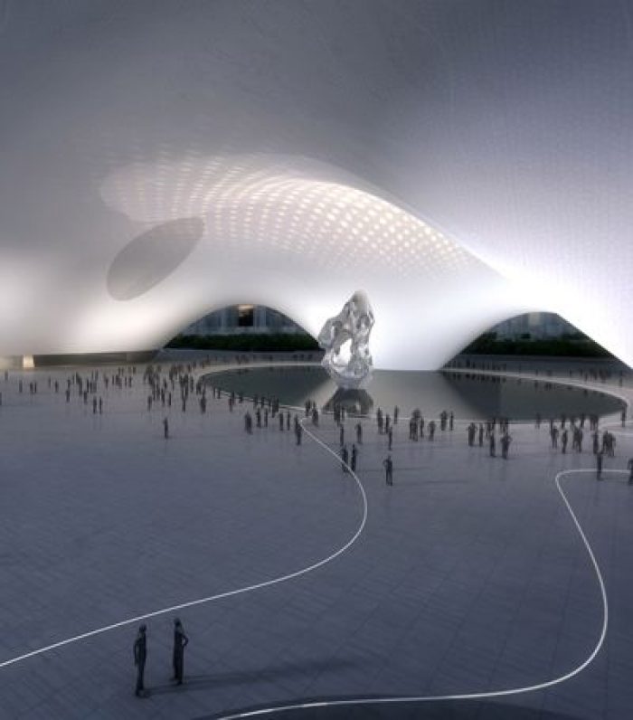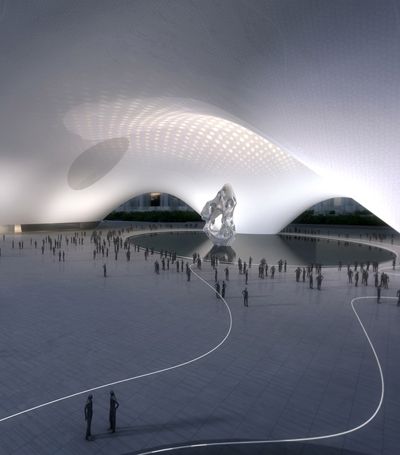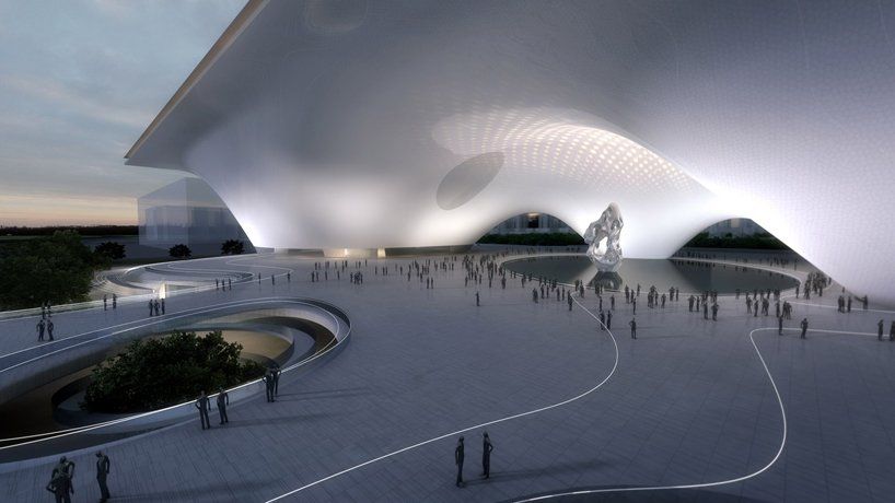 Situated on the central axis of the 2008 Olympic site, and part of a six mega volume masterplan, the main question became, how to design something iconic on an unrealistic and inhuman city scale.The proposal by MAD architects for the new museum is a hybrid between an elevated public square and a floating mega building above.