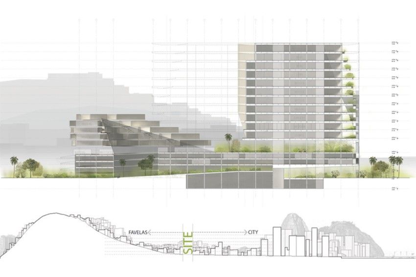 The cost of land and availability of suitable sites in the city demanded a dense, vertically-organized complex. The building section shows how living quarters and public amenities are woven into the structure, never interfering with the hospital operations. Formally the center resembles the character of the city which is defined by the favelas perched on the hills, overlooking city skyscrapers beneath.
