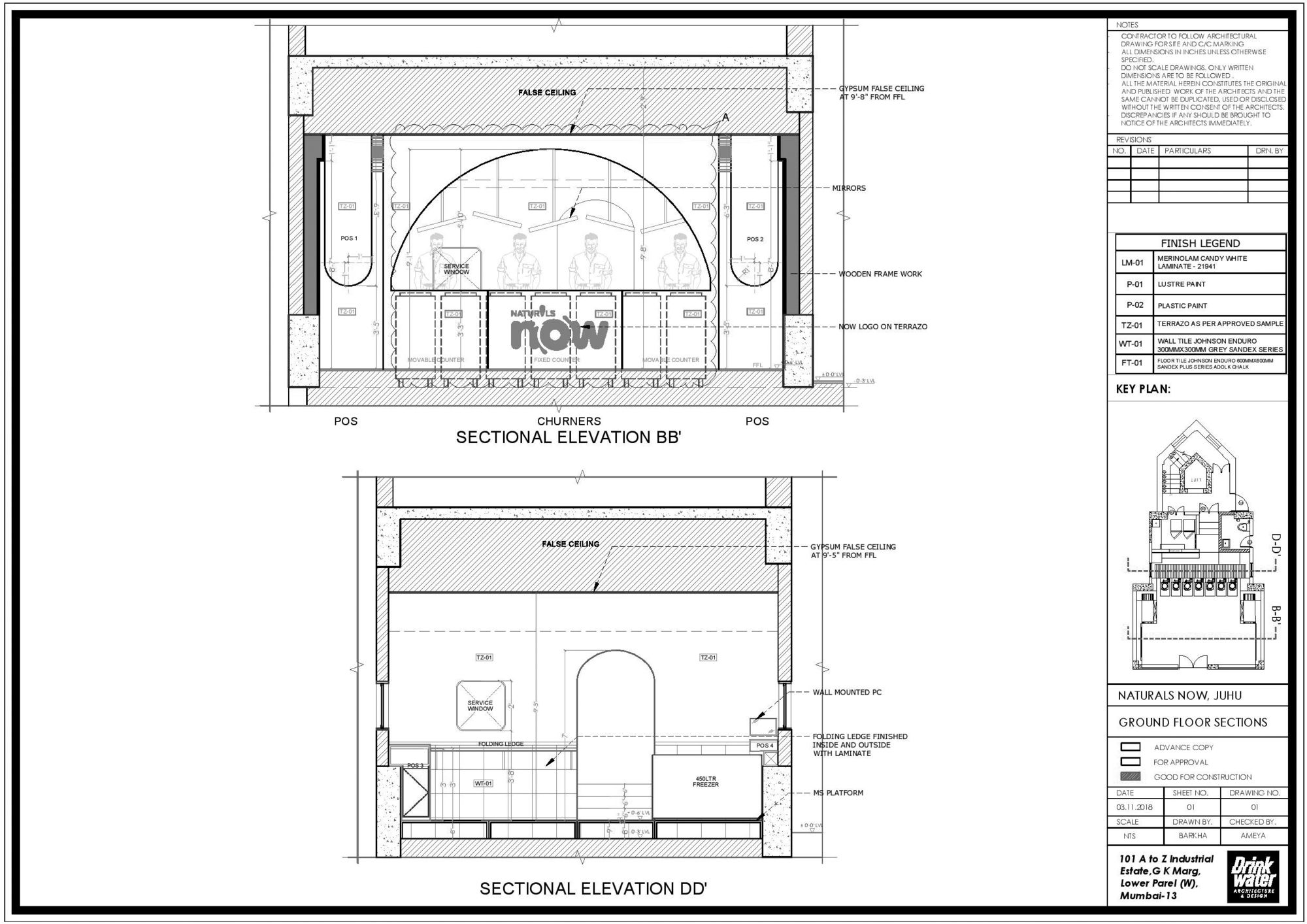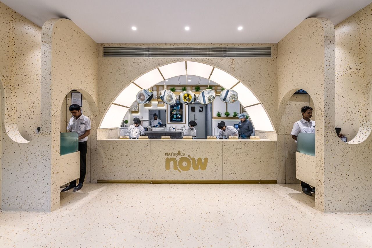As you enter the outlet entrance invites you to walk into an oval mesh that represents the fresh scoop of ice cream quite literally. The epoxy terrazzo with sprinkled raisins brings to life the fruity scoops of Naturals Now. Naturals Now is a full-blown factory-like set-up within a 3 story premises which has many live ice cream churning machines settled against the glass separation in a way that the patrons can see their favorite ice cream getting churned and scooped out of the churner.