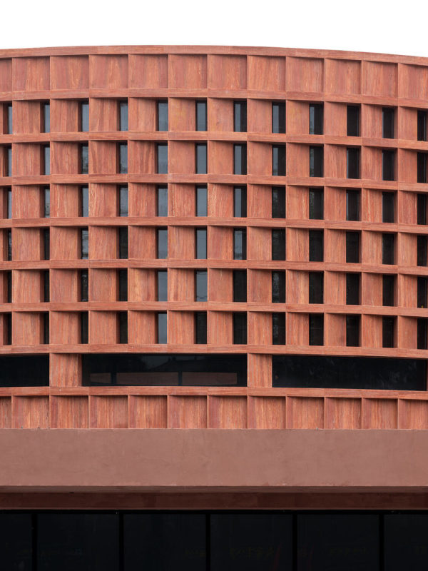 The Monument is the apex of the brand-new Qujiang Museum of Fine Arts, and it features an outdoor amphitheater and bar on its upper levels. The elevation features diamond-shaped red limestone masonry pieces set at intervals to maximize light transmission.
