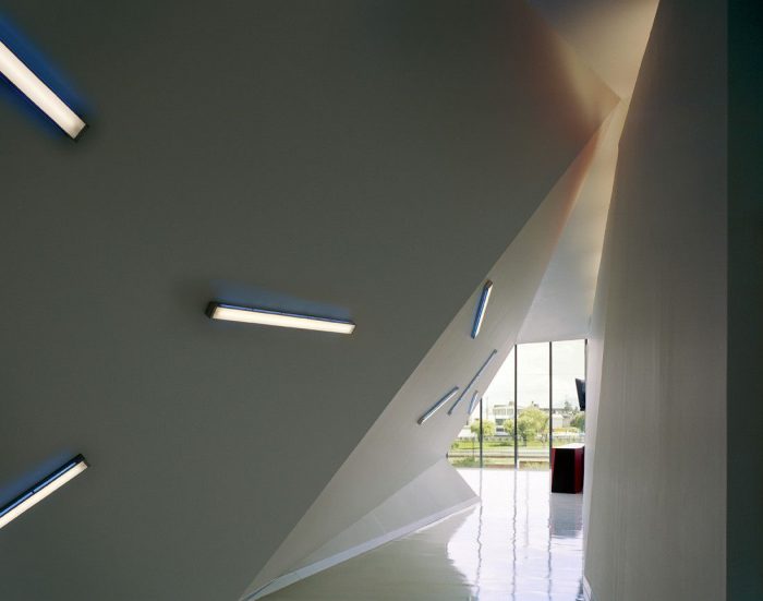 The form and exterior design is a playful folded shape reminiscent of the Nestlé brand and wrapper. The origami form is bright red grabbing the attention of all those that drive along the motorway while adding to the excitement for the visitors before entering the doors.The white detailing along the edges accentuates the angular form and faceted shapes from the outside, and is carried through the interior with the white washed walls, floor and ceiling. The white interior, although plain and somewhat cold, allows for the visitors imagination to run wild, as they take in the glorious smells of chocolate.