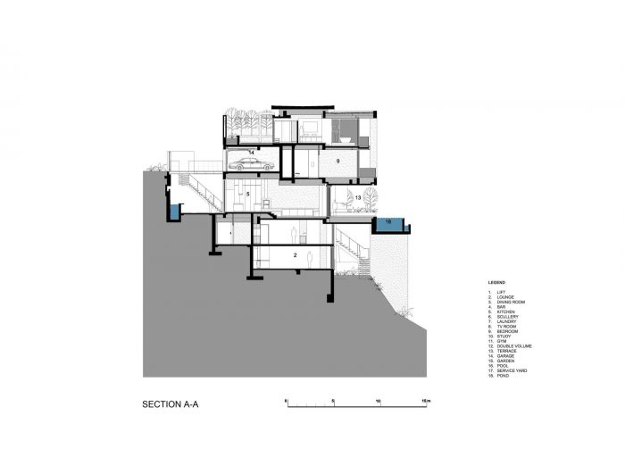 Whilst the site is fairly small at 874.7 sqm, it sloped away dramatically, resulting in a house of 5 separate floors which in many instances connects to the adjacent natural ground levels, or raised platforms. One accesses the house at the midlevel between the second and the highest floor, resulting in the house being only 2 stories above Nettleton Road.