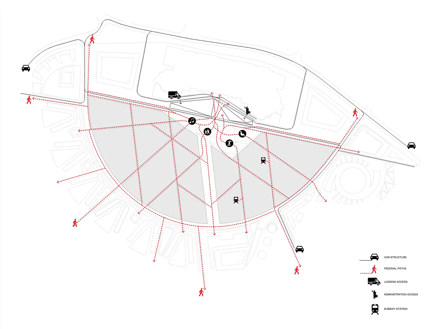 The shape of the exterior is what provokes and attracts visitors to further explore. So the physical transparency of the building is transformed into a metaphor for ‘a glimpse of its inner organization’. This leads to Level 2 – the transition and continuation from the exterior and the surrounding environment to the interior, habitual space. This level promotes for a multi-purpose usage: it is both open and spacious, offering much natural light to penetrate it. Hence, it offers good conditions for stimulated social interaction and relations building. It offers good conditions for exhibitions and performances, or it could just be accommodated one essential need – the free circulation and transition of the visitor.