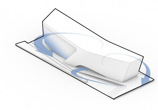 The design provides various exhibition and gathering spaces for both programmed and passive interaction between local visitors, tourist and the various exhibits of architecture, painting, sculpture, fashion and textiles. Two such external spaces activate the site and enhance the Puerto Madero waterfront promenade experience. By recessing the corners of the East façade a plaza is created to the South and an amphitheater to the North. A large framed opening in the North elevation holds a dual-direction stage linking the interior auditorium with the exterior amphitheater. Large retractable panel doors enable performances for visitors located inside, outside or both simultaneously.