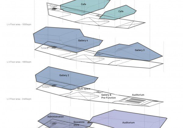 From beneath the building visitors enter into a four-story atrium which acts as the vertical spine connecting the exhibition spaces above. To the North and South of the atrium are three levels of single and double height galleries. Minimal walls create variable separation of the spaces, catering to the requirements of the curators. The open atrium is traversed by a walkway gallery along the west façade, connecting the two ends of the building. The top of the atrium space is punctuated by a large café which provides views to the various galleries below