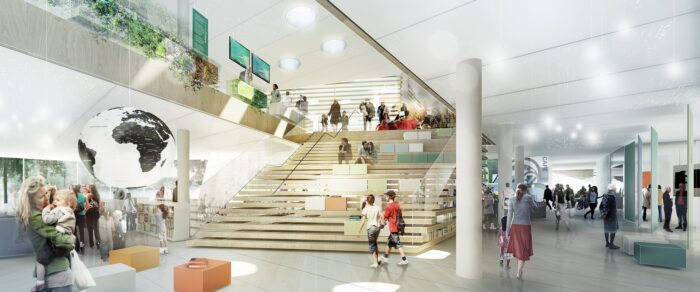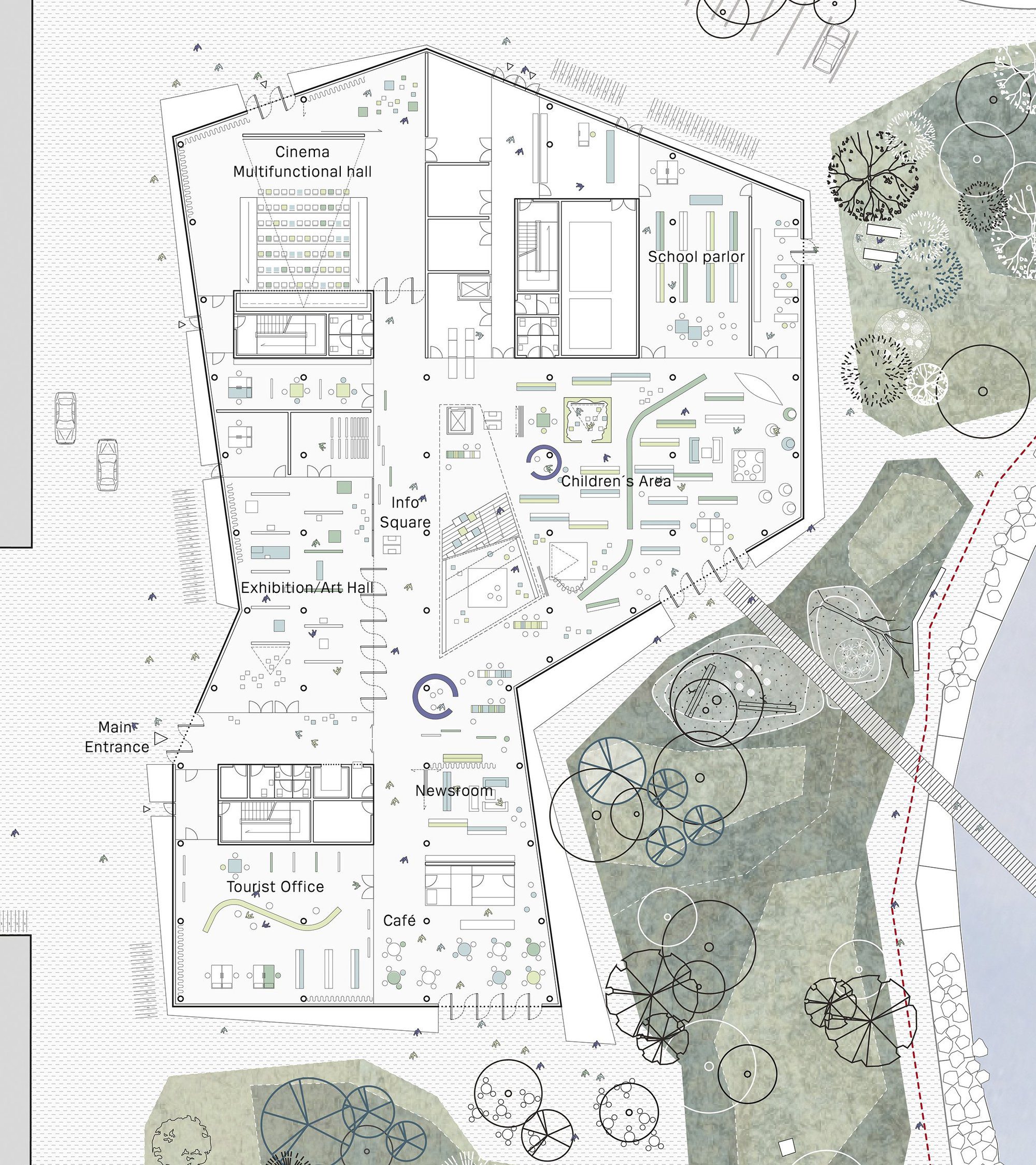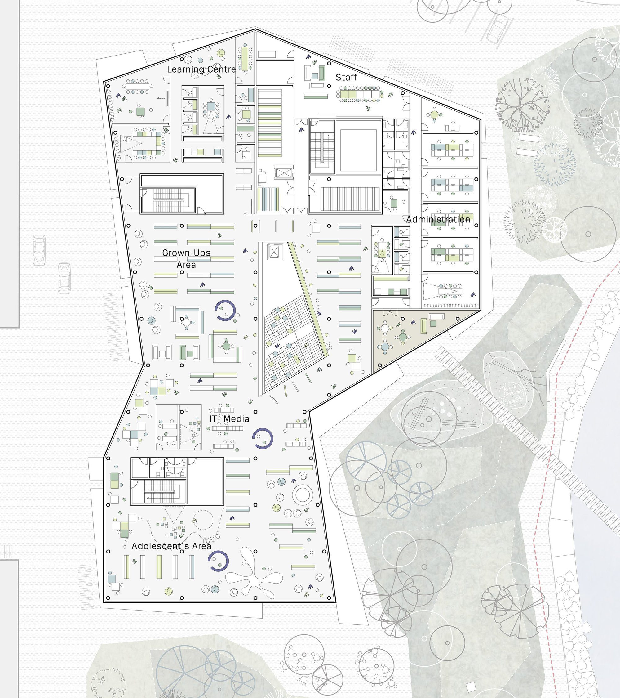 The main access to the Cultural Centre and Library will be from the square at Östra Piren. A large glass facade ensures visual contact between the inside of the building and the surroundings. Visitors will be able to get an overview of the whole cultural centre from the information square and the atrium in the centre of the building. The different functions are carefully situated to create synergy while ensuring open, flexible and accessible spaces that invite visitors to interact, be curious and create.