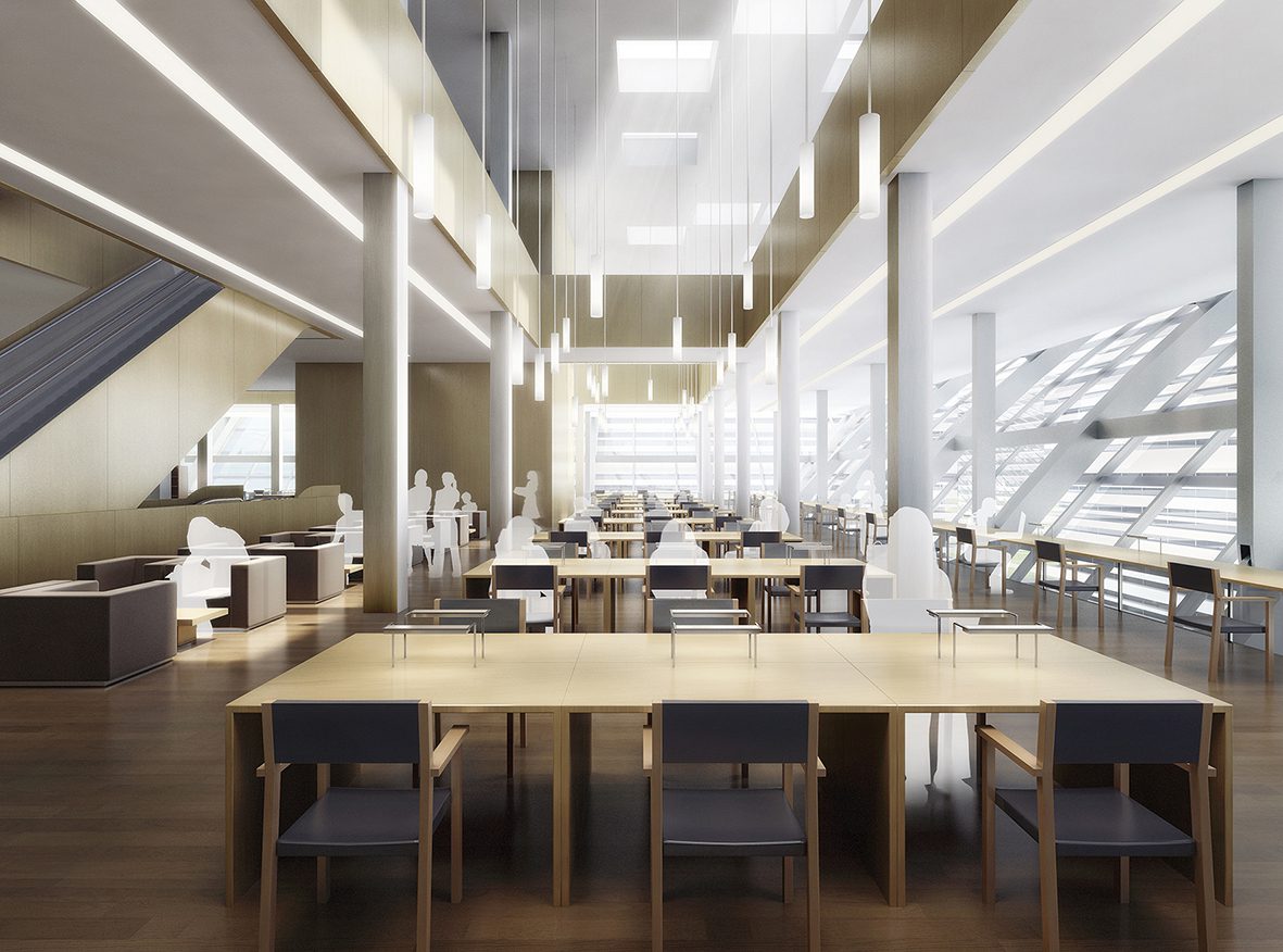The new library building on a site next to one of these extended watercourses is intended to provide the traditional library functions as well as other public functions, such as a cinema and exhibition rooms, and an above-ground storage facility for 7 million books. With an area of 6,500 sqm and a clear story height of 15 m, this fully automated high-bay storage facility – the first of its kind in China – occupies a large volume in the overall building complex, which has a total area of 32,000 sqm.