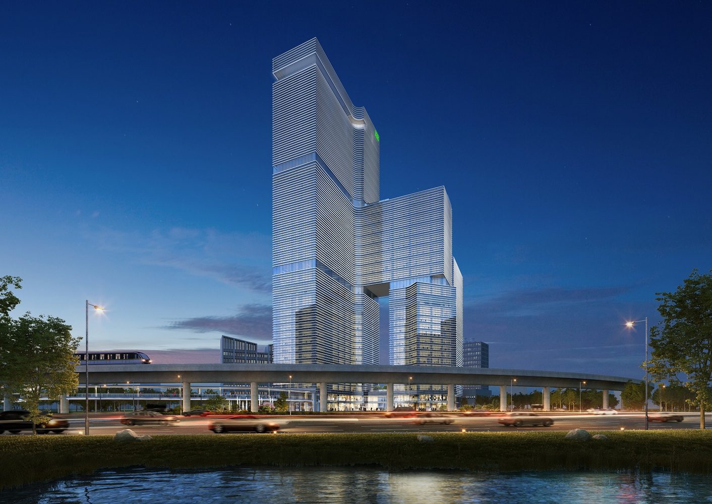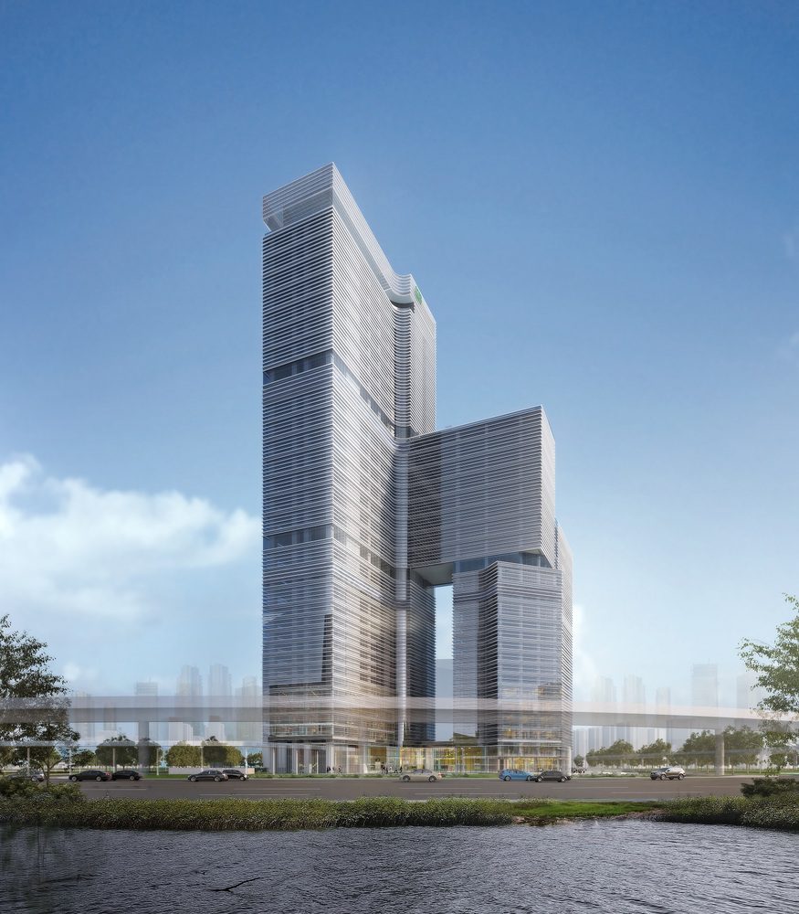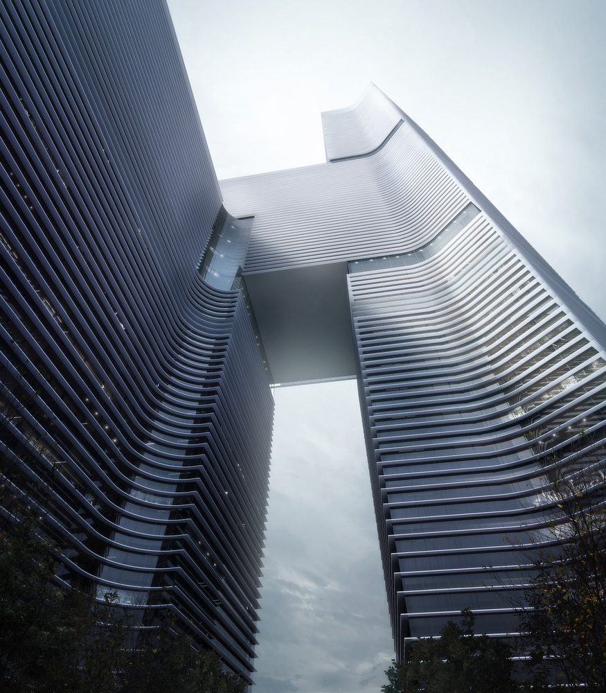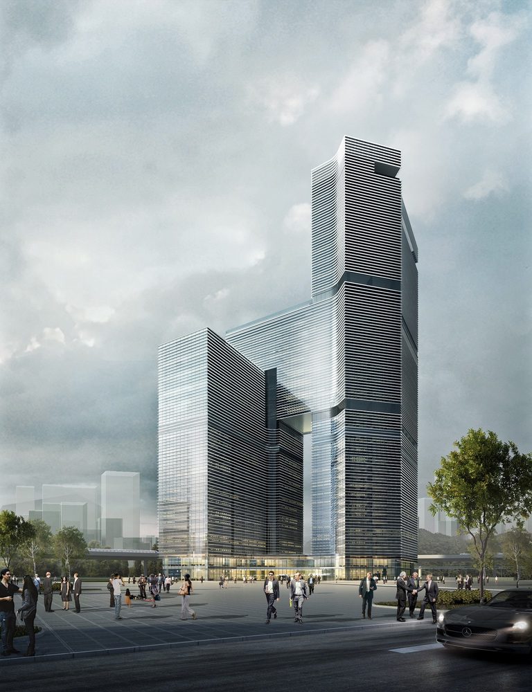The building is composed of two separate masses of different heights. They are based on a podium and bridged by a third mass right above the lower of the two masses. The complex form is enveloped in a simple repetitive skin of glass and horizontal fins for shading for per each floor. The project is expected to be finished by 2020.