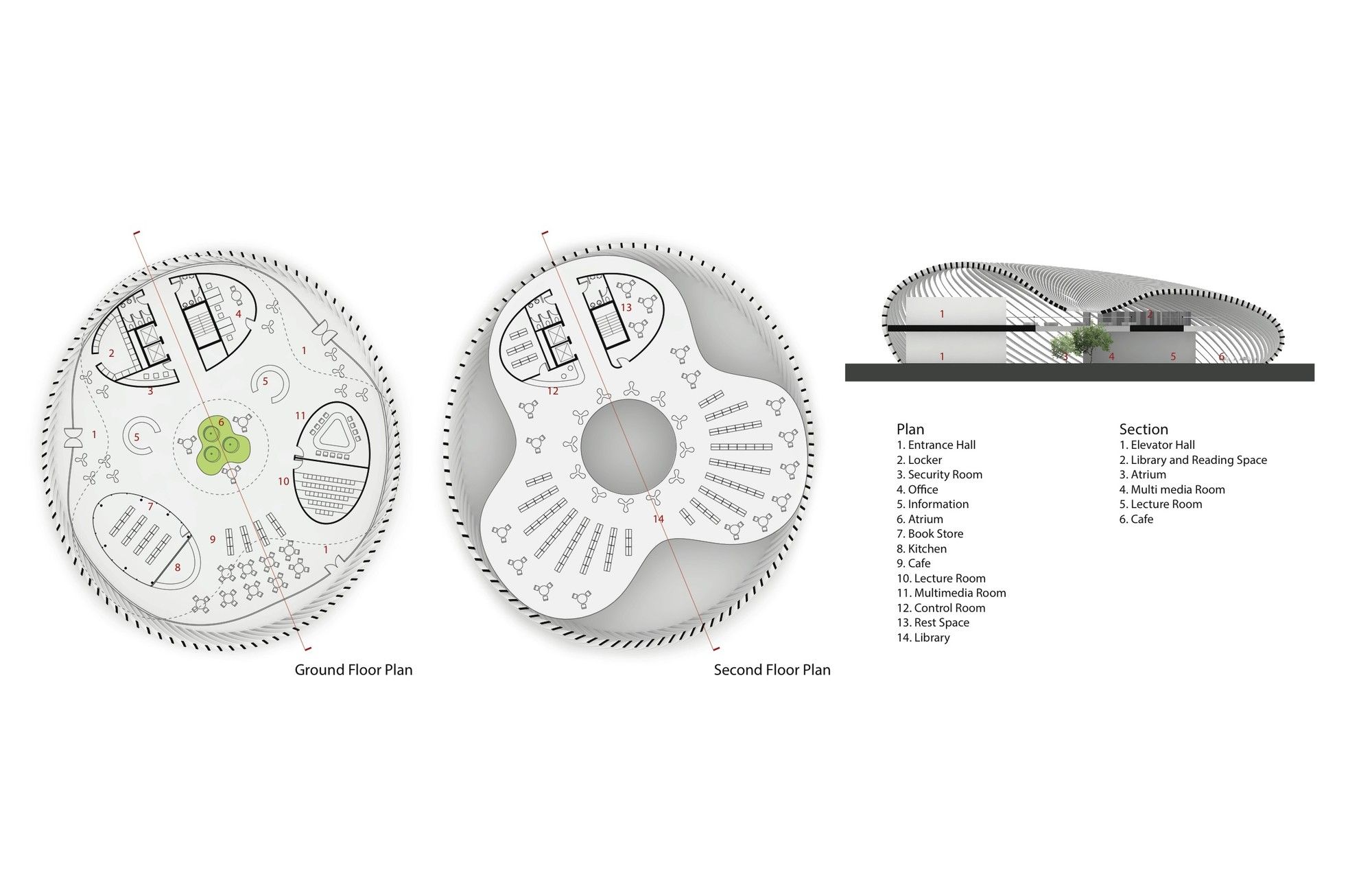 Public space, a spacious entrance hall, lecture and multimedia rooms, a bookstore, cafe and locker are all located on the ground floor. Additional library and reading space is located on the second floor with filtered daylight and panoramic city views.