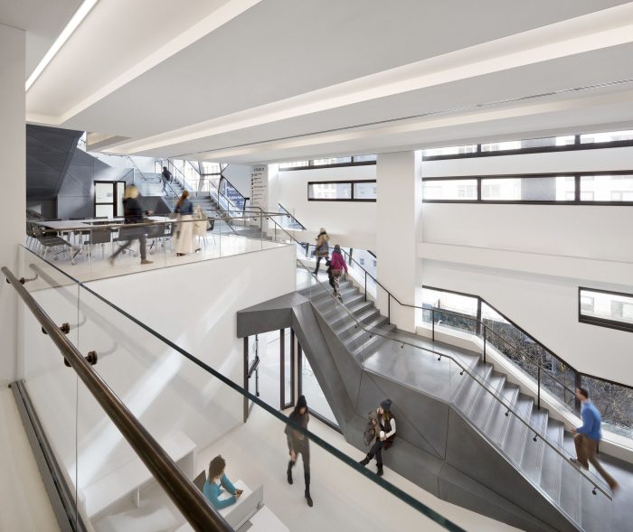 A central stair is the principle design feature in the University Center – a focal point both inside and outside the building. These stairs are intended as a principal means of circulation through the building for the physically able. Through the use of clerestory windows in hallways and on the facade, the University Center provides day-lighting along paths . The design is organized to encourage walking between destinations, as well as spaces for social interaction. The building provides bike storage rooms and showers to encourage cycling, walking and running between home and school. The building was recognized by Former Mayor Michael Bloomberg as a model of successful implementation of ‘active design’ strategies that are part of New York City’s anti-obesity and health initiatives. Virtually all schools and departments are represented in this building. Program adjacencies are intentionally planned to promote collaboration and spontaneous interactions within generous circulation and social spaces.