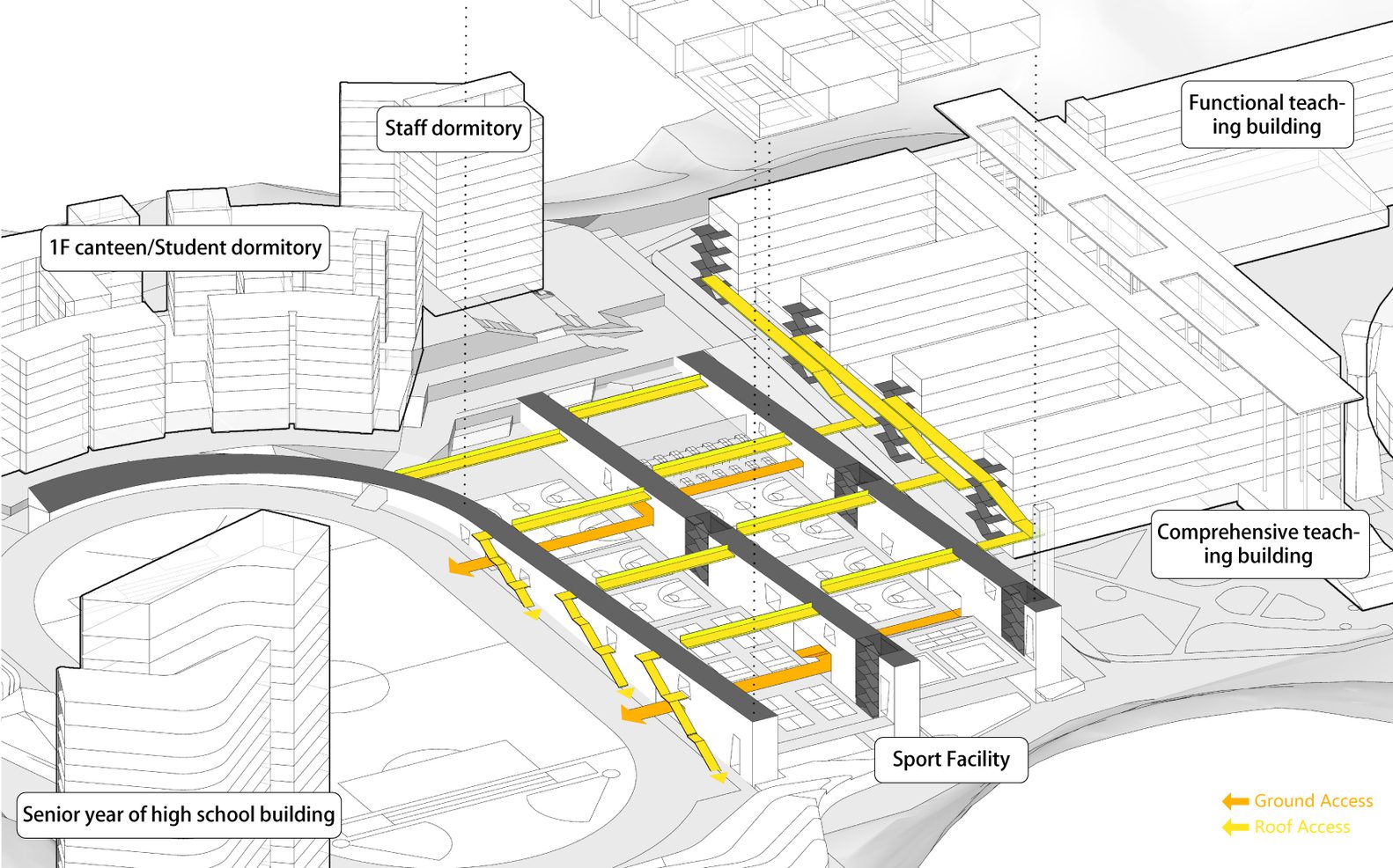 Under the background of rapid urbanization, standardize construction of Hongling High School campuses were widely built in Shenzhen in the past 20 years. As part of “New Campus Action”, the design attempts to re-connect the campus to its natural environment, and create a new place meaning through a very logical building strategy. The design targets to use the central-location site to inter-weave a comprehensive complex that offers a wider range of spaces for cultural and sports activities, while at the same time, re-establish the circulation, communication and sharing in the campus, and create a coexistence of human and nature.