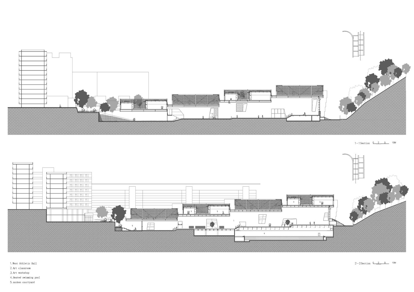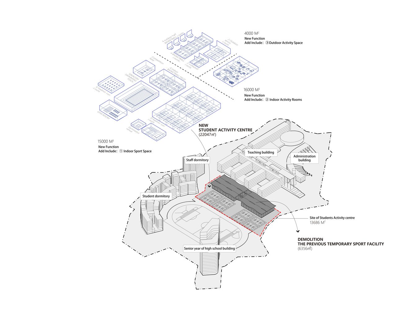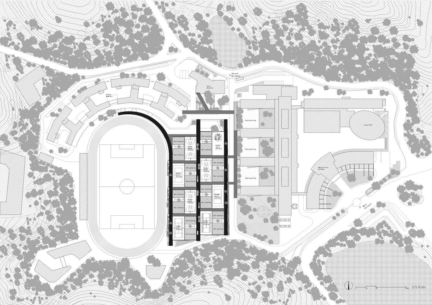 The design originates from natural geography. The new Activity Centre is conceived as topographical extension of the hill to the south of the campus, 5 to 6 meters wide hill-shaped infrastructural buildings define 2 large terraced-floor semi-indoor spaces, responding the briefs demand on various types of sport activities.