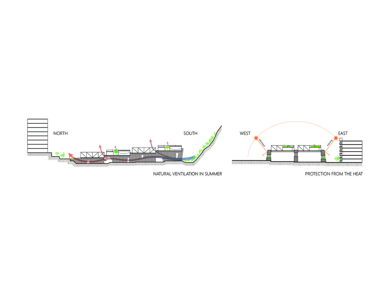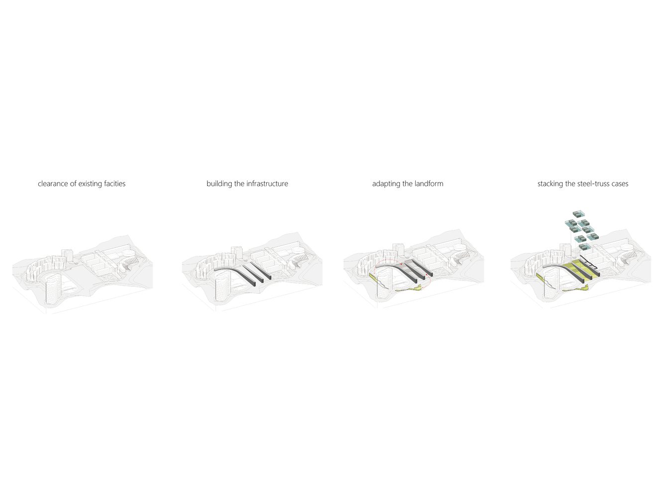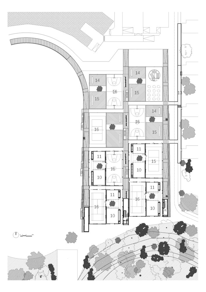 The design originates from natural geography. The new Activity Centre is conceived as topographical extension of the hill to the south of the campus, 5 to 6 meters wide hill-shaped infrastructural buildings define 2 large terraced-floor semi-indoor spaces, responding the briefs demand on various types of sport activities.
