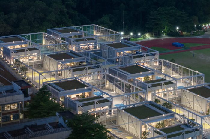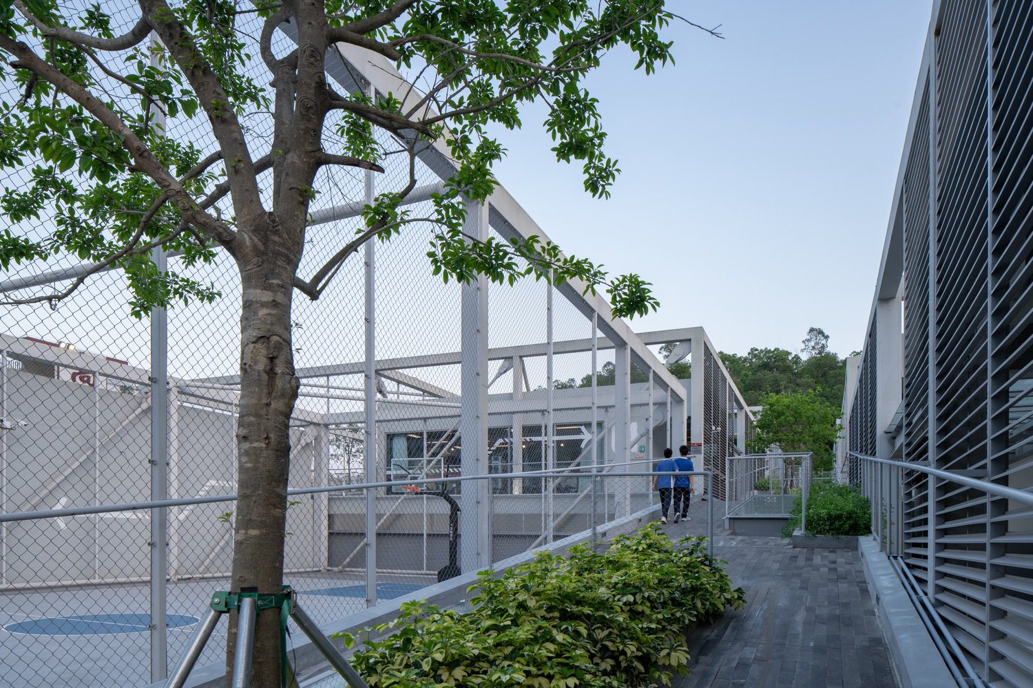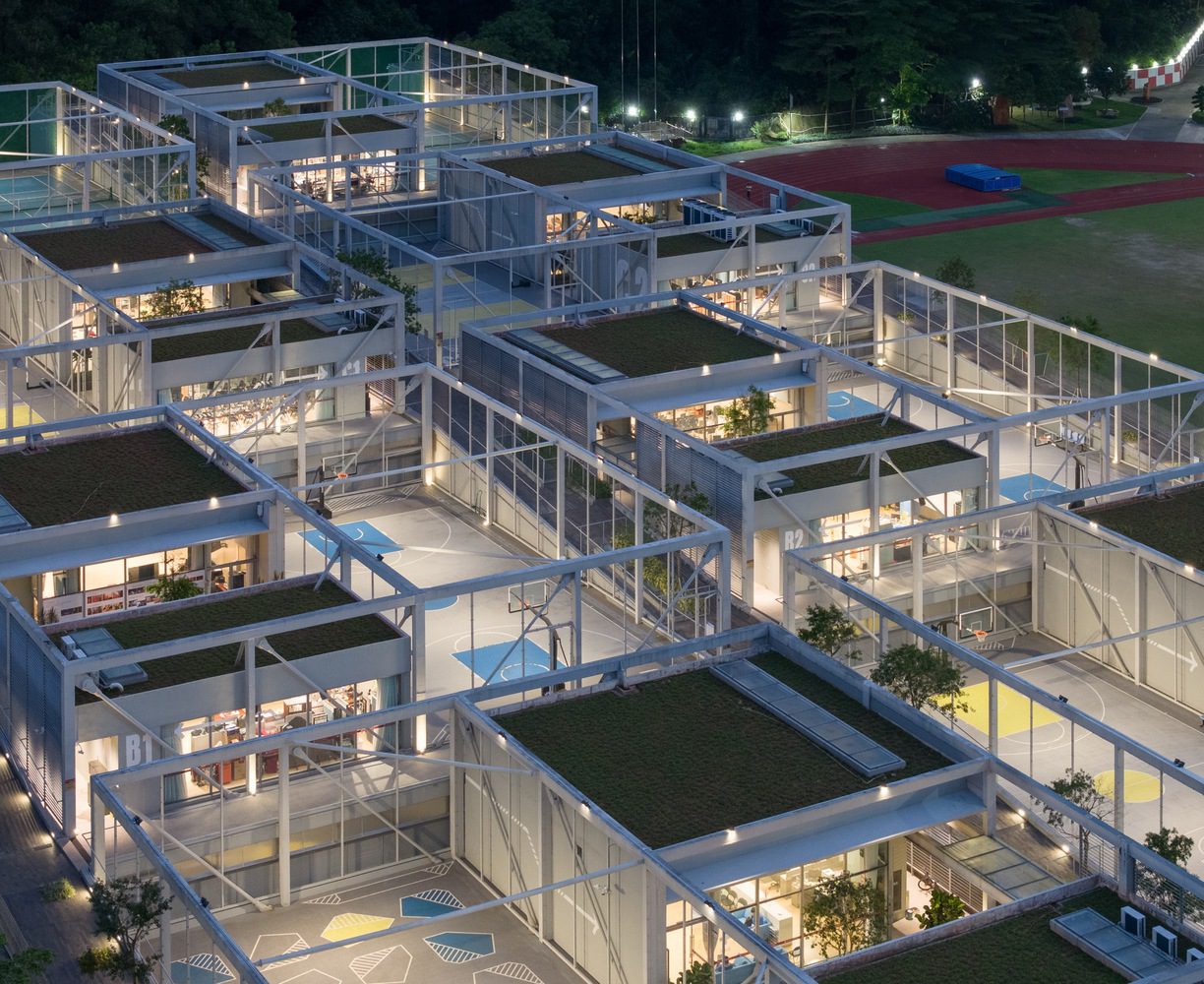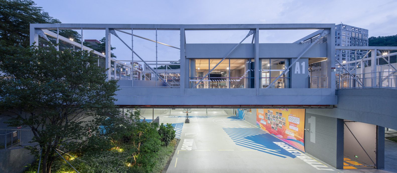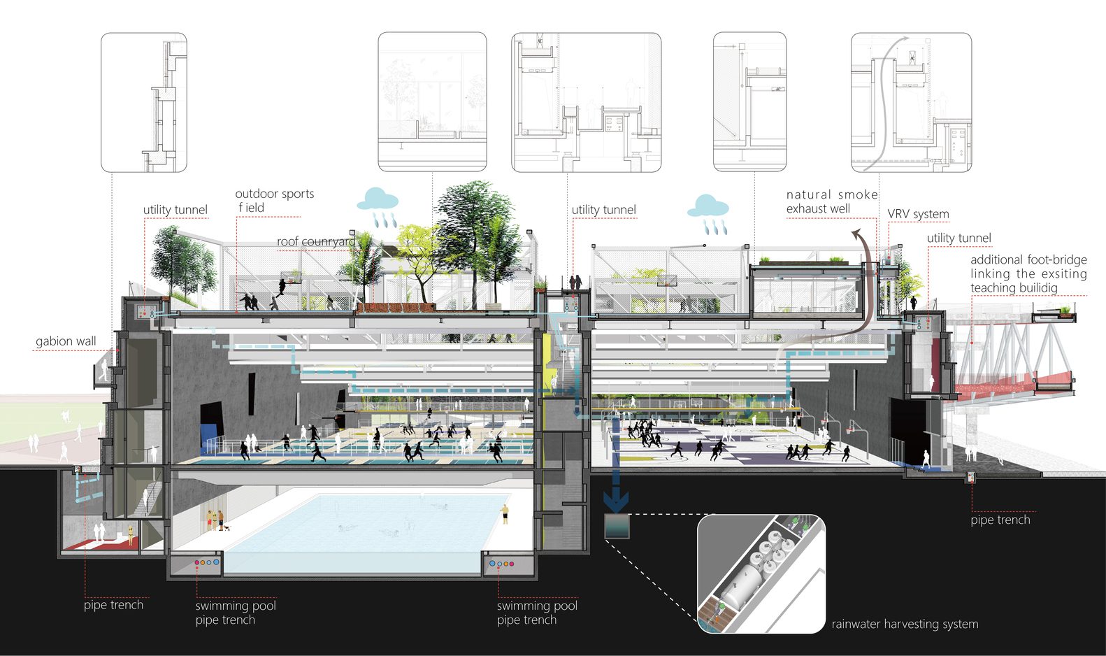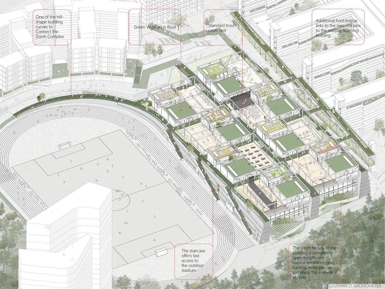 Above the natural-ventilated sport halls are the 30-meter-square steel truss-cases supported by the sloping buildings, which house indoor and outdoor social activity rooms. With 3-dimetional greenery system incorporated, the 8 assembled units are lined up on two columns along the sloping buildings. The 2 built components together form a natural campus activity cluster.