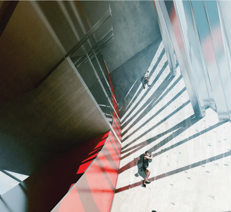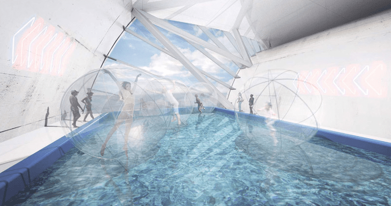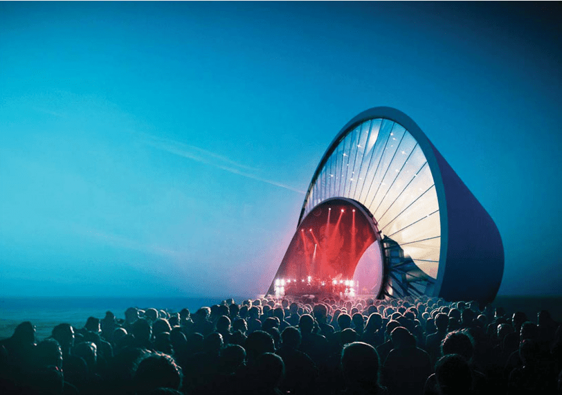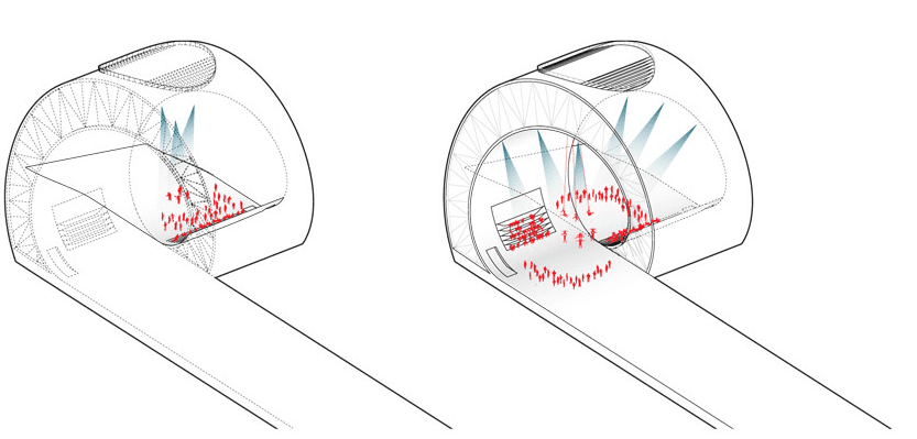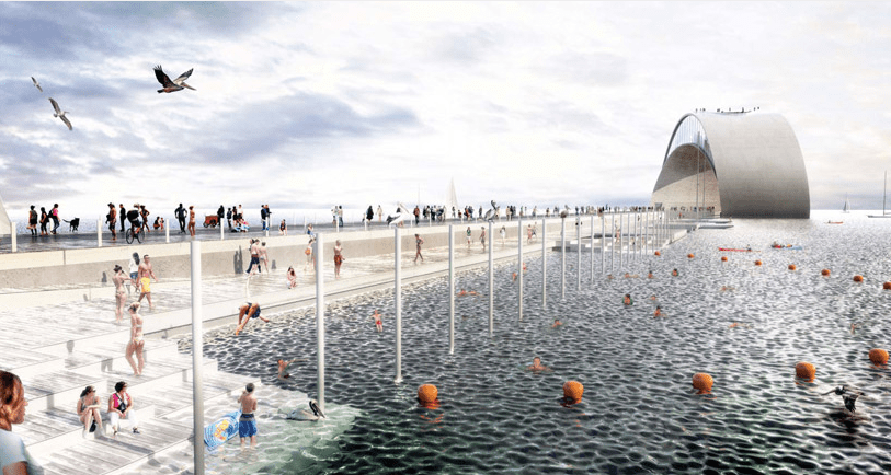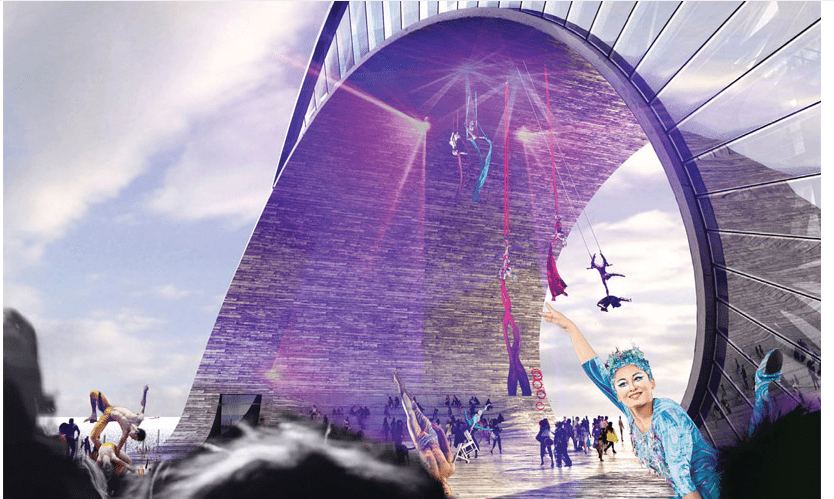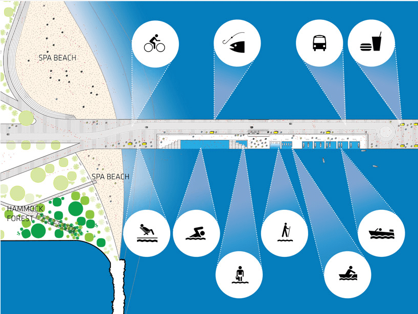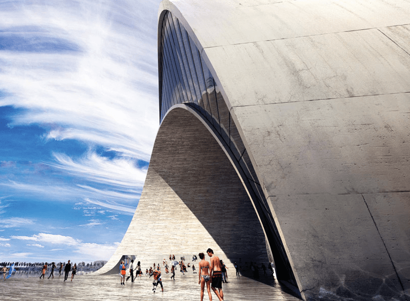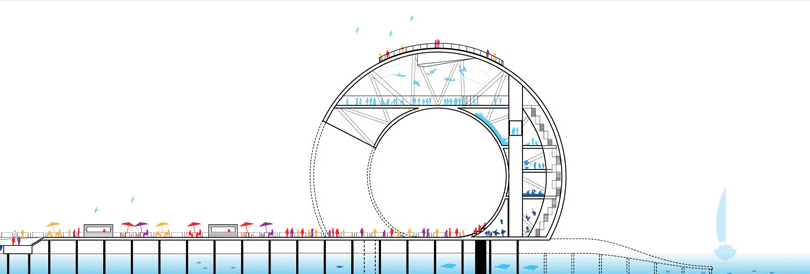 Its strong form and generous spaces can accommodate a multitude of programs. Its sculptural exterior creates a series of public spaces: the rooftop outlook on the break of the wave, the spectator stands in the curl of the wave, the covered stage under the arch of the loop and the beach as the pier dives into the water. Within the thickness of the wave a cascade of programmable spaces form a single loop. Over time its spaces can be combined or partitioned to suit the needs and opportunities for the city and its citizens.