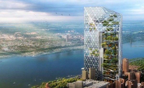 To avoid a wind-tunnel effect within the structural voids the vertical garden’s foliage made up of perennial trees and conifers offer protection. In the end these strategies along with the use of solar panels and microturbines the structure achieves carbon neutrality and a net-positive energy skyscraper perfect for uptown Manhattan