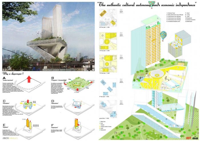 The impressive New York City Theater project is designed by David Vecchi & Emanuela Ortolani. The proposal is for a mixed-use building that has been developed under various economic concerns, to maximize the potential value of the plot (Given the high price of land in Manhattan) and also due to the high sale price of the real estate units in Manhattan. Thus, in addition to the main function of theater, the design includes some real estate units that will also have the basic task of funding the theatrical activity.