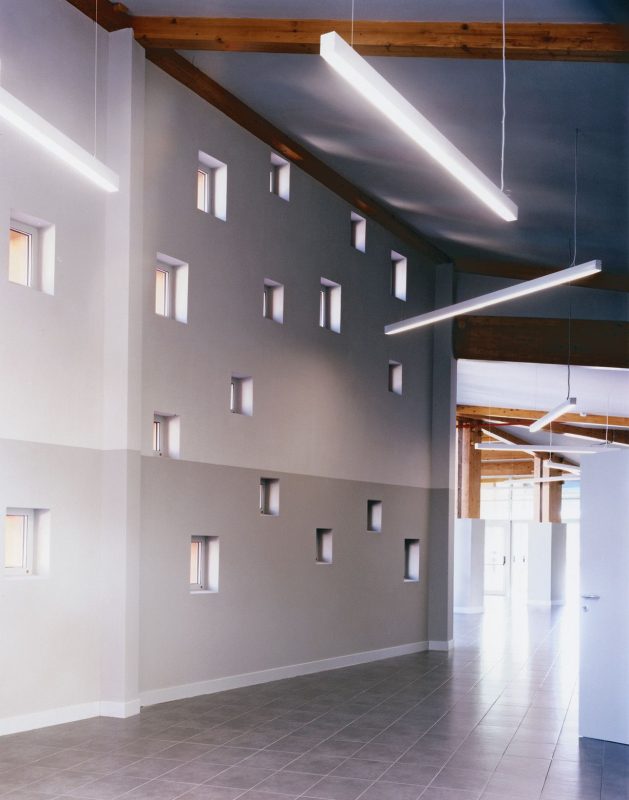 A society that decides to act and participate, begins with the construction of schools. A community that believes in the school as a major public building and self-representation is a community that interacts with history, with the collective sentiments and the future.Designing, building a school is a public event. We have therefore imagined a building that was both representative, functional and recognizable, featured with the ability to communicate with the territory and the landscape, but protected and protective at the same time. The project stems from the territorial elements: the horizontal line of the lot, its green, the profile of the mountains, the hills, and the sky.